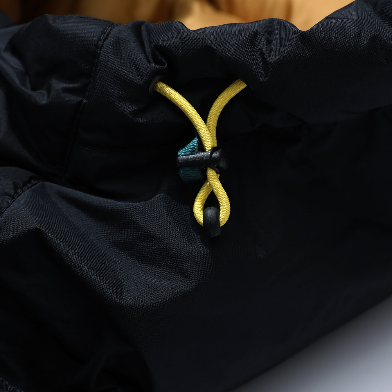 ナンガ独自の防水透湿生地“オーロラテックス®︎”に映えるフードのスピンドルとジップの引き手は、麺とネギを思わせる遊び心の効いた色使いになっています。