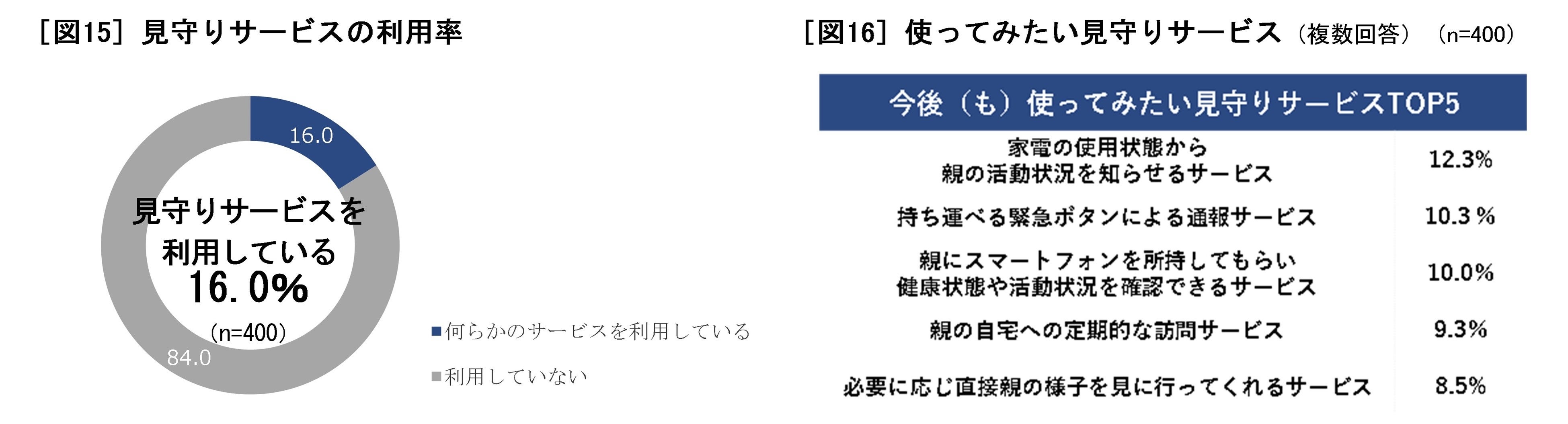 さらに、今後使ってみたい見守りサービスを聞くと、「家電の使用状態から親の活動状況を知らせるサービス」(12.3%)や「持ち運べる緊急ボタンによる通報サービス」(10.3%)などが人気を集めました。別居している親を思う子にとって、親の身の回りで異変が起きたとき、すぐに知らせてくれるサービスへのニーズの高さが読み取れます【図16】。