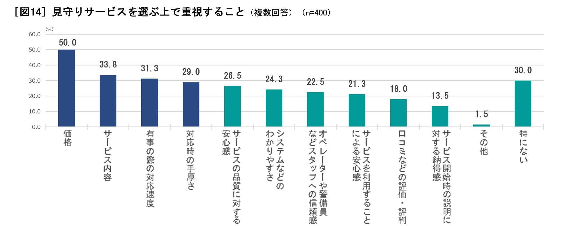 離れて暮らす親のために見守りサービスを利用すると仮定し、サービスを選ぶ上で重視することを聞きました。上位に挙がったのは「価格」(50.0%)「サービス内容」(33.8%)でしたが、「有事の際の対応速度」(31.3%)や「対応時の手厚さ」(29.0%)も3割前後と検討材料になることが分かりました【図14】。