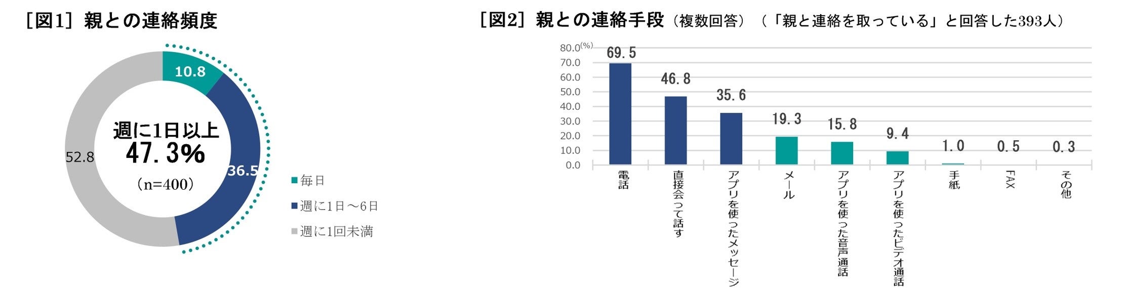 連絡頻度は「週に1日以上」の人が47.3%【図1】、連絡手段は1位「電話」(69.5%)、 2位「直接会って話す」(46.8%)、3位「アプリを使ったメッセージ」(35.6%)となりました【図2】。