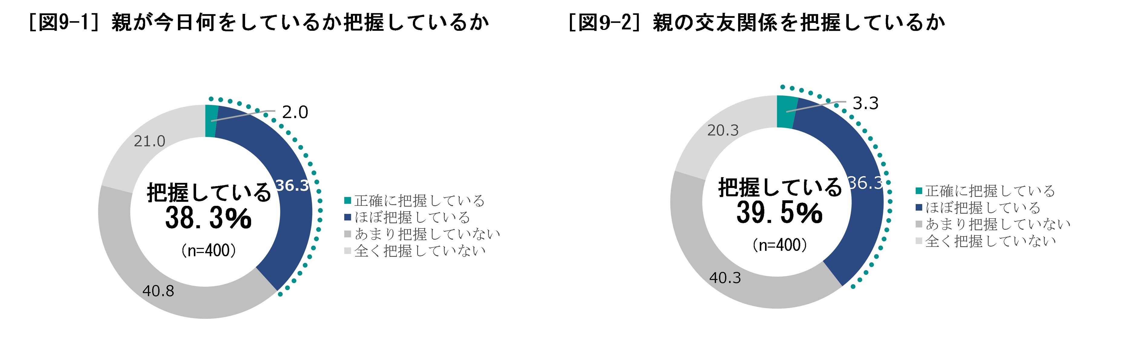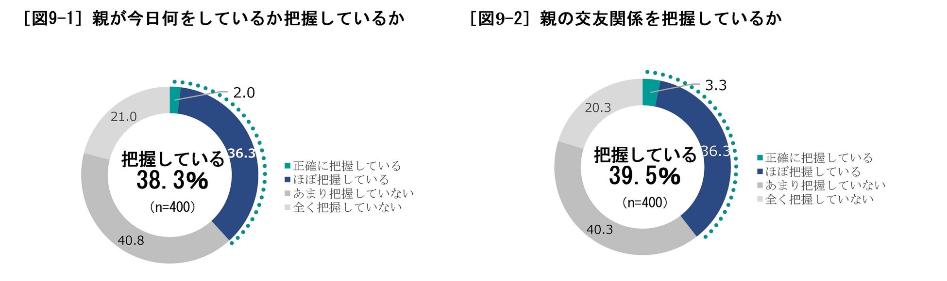 別居している親に関して8割超が不安を感じていることが分かりましたが、親が今日何をしているか把握しているか聞くと、「把握している」(「正確に把握している」「ほぼ把握している」の合計)と答えたのはわずか38.3%で【図9-1】で、交友関係を把握しているかという設問でも、「把握している」のは39.5%にとどまっています【図9-2】。いずれの設問でも把握できていない人が6割を超え、別居している親とのコミュニケーションの難しさがうかがえる結果となりました。