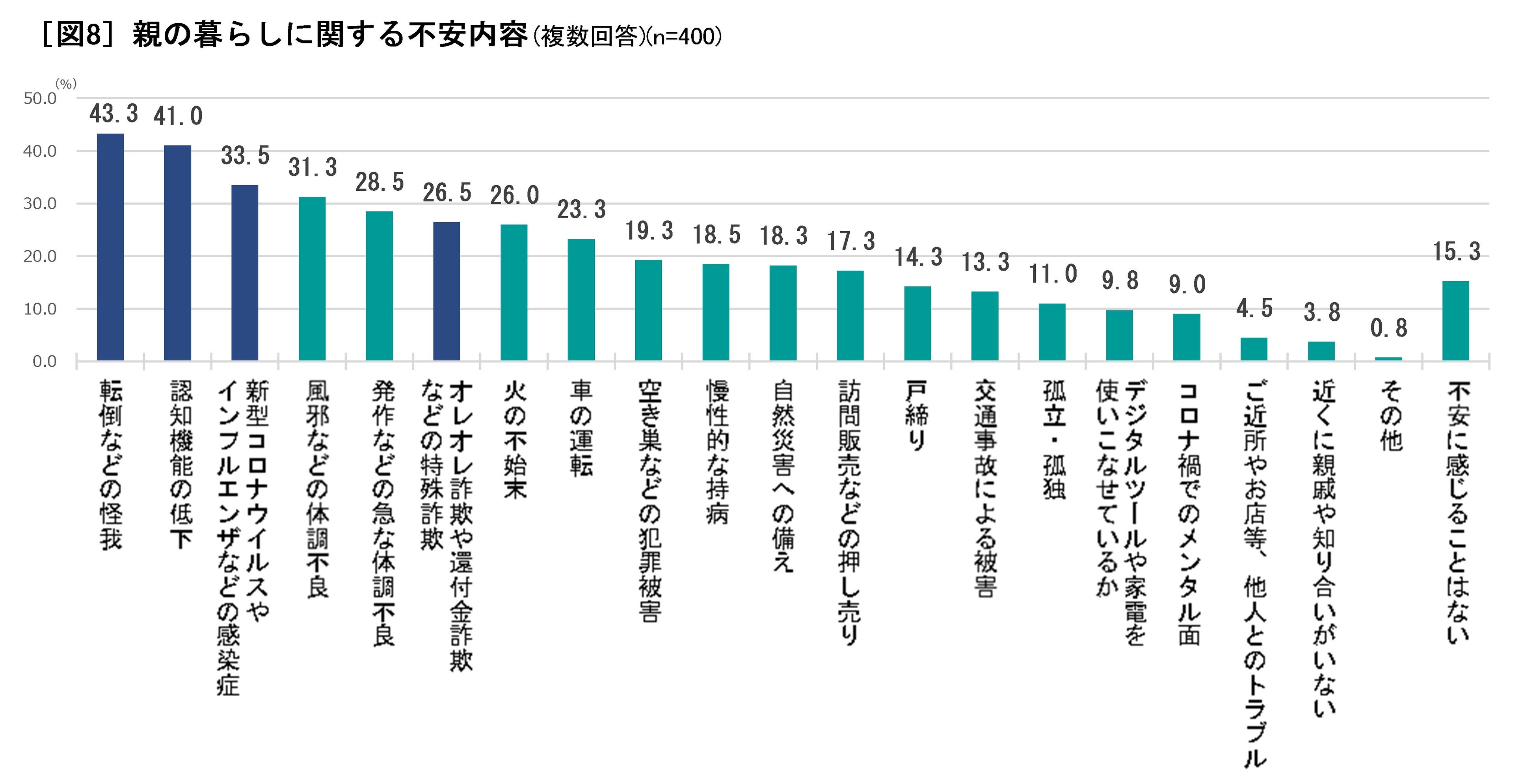 具体的な不安のトップ3は、1位「転倒などの怪我」(43.3%)、2位「認知機能の低下」(41.0%)、3位「新型コロナウイルスやインフルエンザなどの感染症」(33.5%)で、いずれも健康面における不安となりました。他にも「オレオレ詐欺や還付金詐欺などの特殊詐欺」といった、近年増加している詐欺被害への不安も上位に上りました【図8】。