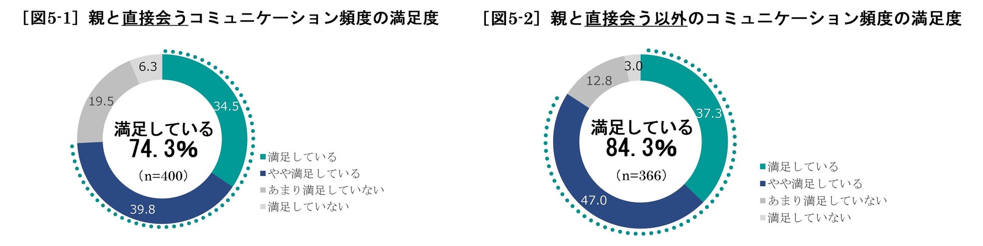 このように社会環境の変化も影響し、離れて暮らす親との距離が広がってしまったようにも見えますが、直接会うコミュニケーションと直接会う以外のコミュニケーションそれぞれの満足度を聞いたところ、「直接会うコミュニケーション頻度に満足している」が74.3%【図5-1】、「直接会う以外のコミュニケーション頻度に満足している」が84.3%【図5-2】と一定数の人が満足できていることが分かりました(それぞれ「満足している」「やや満足している」の合計)。