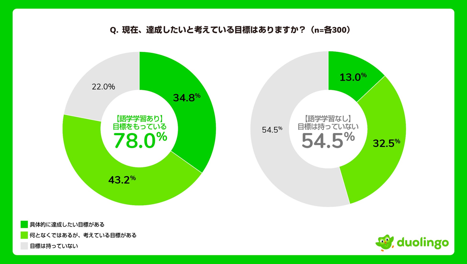 具体的に達成したい目標があると回答した語学学習者は34.8%、さらに、なんとなく考えている目標があると回答した人は43.2%。一方で、54.5%の非学習者は、目標を持っていないと回答