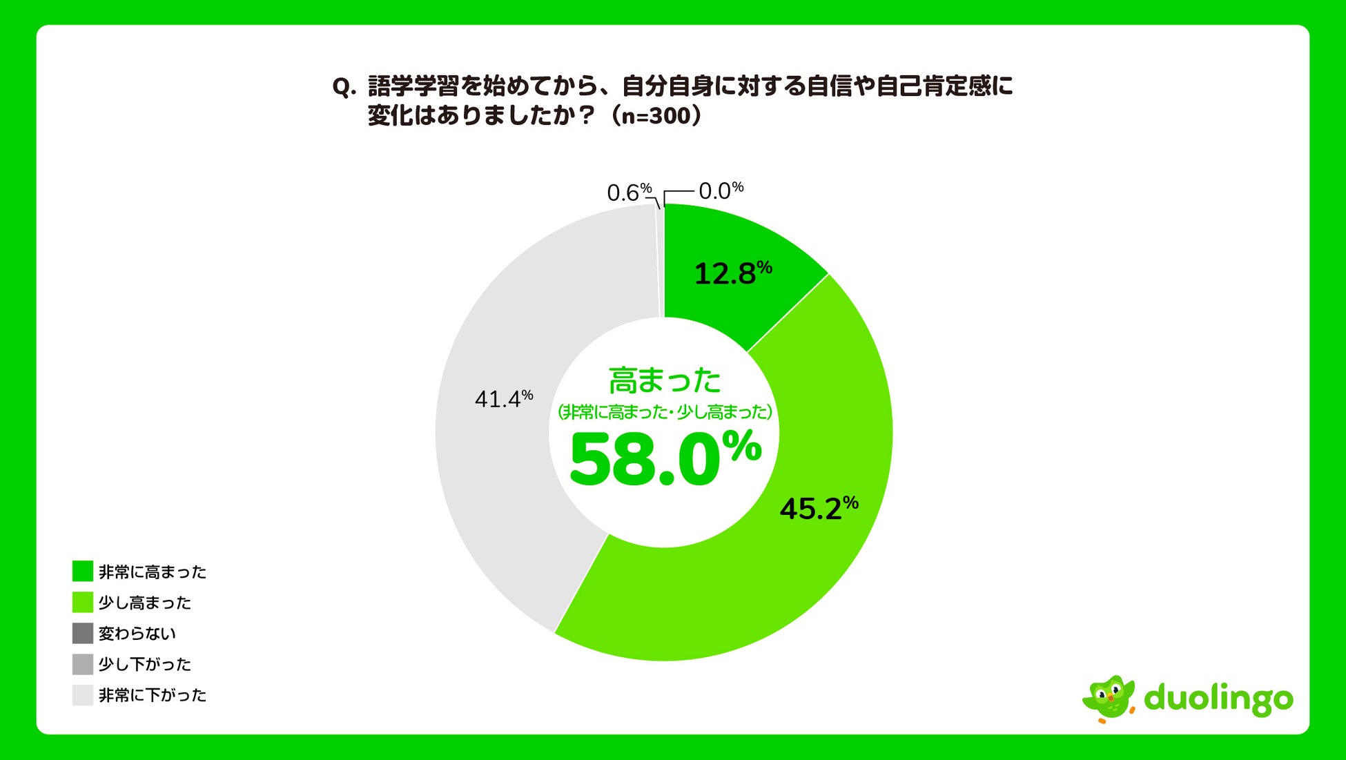 さらに、語学学習者に対して「語学学習を始めてから、自分自身に対する自信や自己肯定感に変化はありましたか?」と尋ねたところ、高まった(非常に高まった・少し高まった)と回答した人が58%となり、語学学習が自己肯定感の向上にも寄与していることが示唆されました。