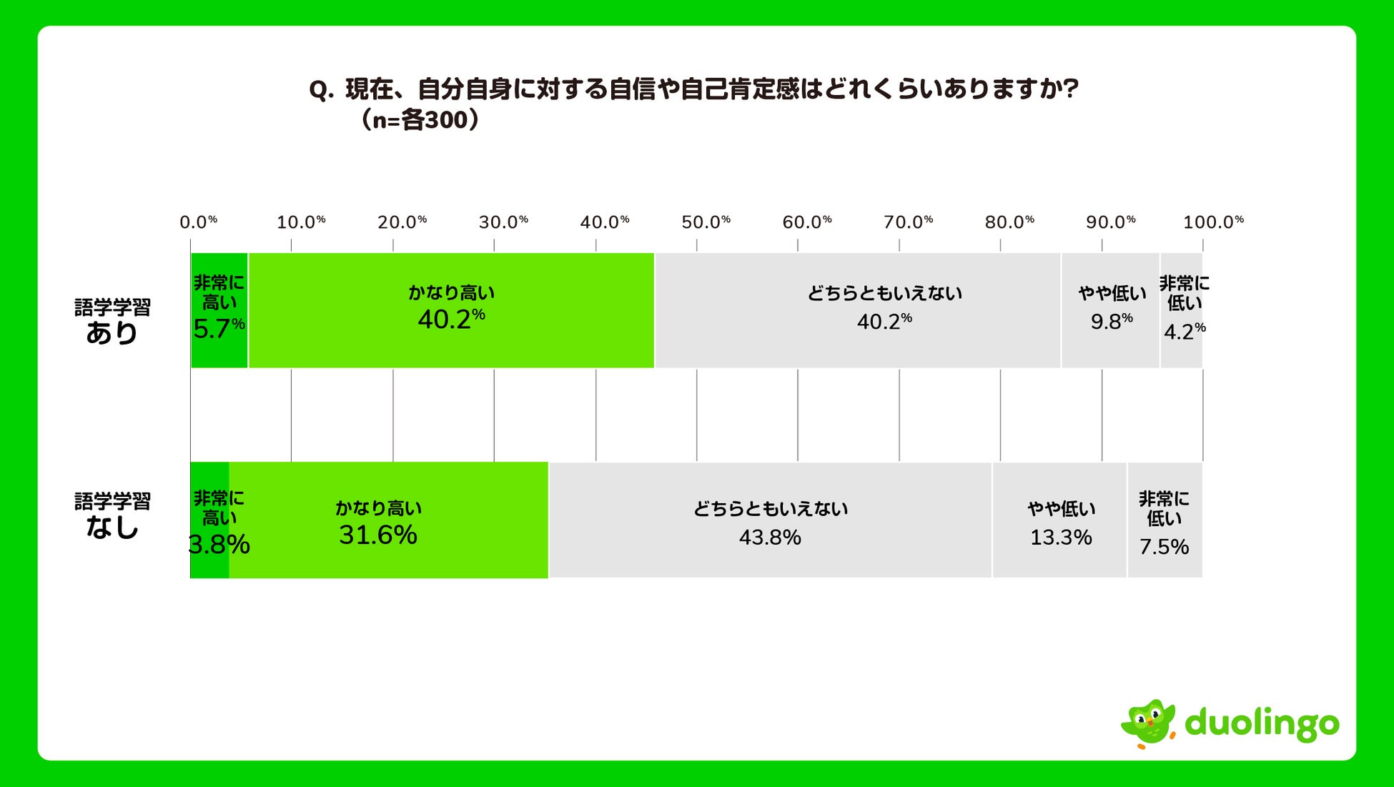 語学学習者は、現在の自分自身に対しての自信や自己肯定感が非学習者よりも高めの傾向(「非常に高い/かなり高い」と回答した語学学習者の45.9%、非学習者では35.4%)