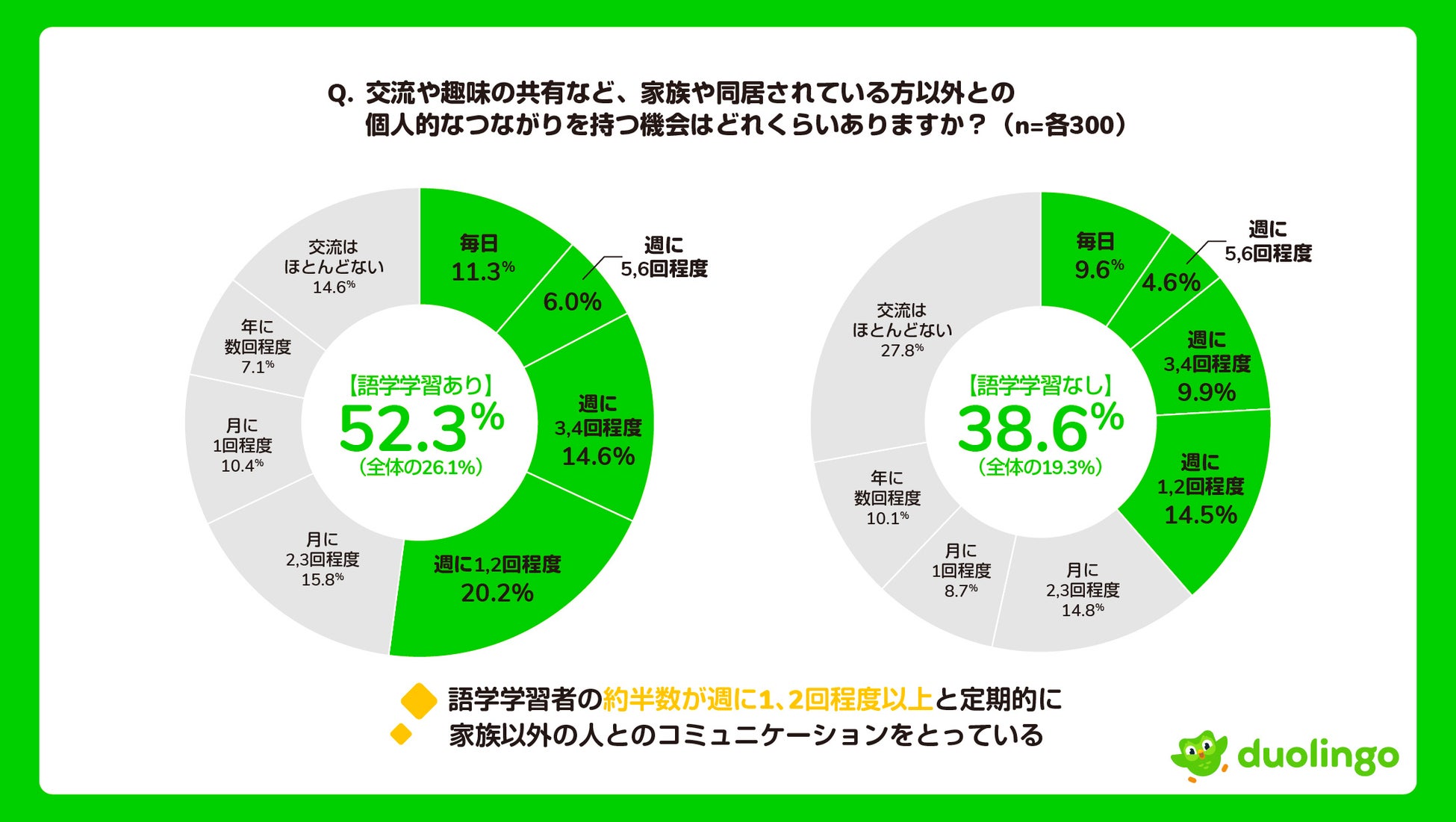 語学学習者の約半数が週に1、2回程度以上と定期的に家族以外の人とのコミュニケーションをとっている