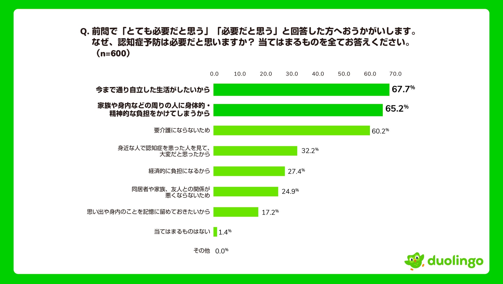 「人生100年時代」を迎え、健康寿命の延伸することが健康で自分らしい暮らしを続けることに繋がり、そのためには健康だけではなく、人や地域とのつながりや、生きがいを持つことが大切だと言われています。日本において、厚生労働省は2019年に「健康寿命延伸プラン」を策定し、2040年までに男女ともに健康寿命の3年以上延伸を掲げました。そのなかで具体的な取り組みの柱の一つとして「介護予防・フレイル対策、認知症予防」が位置づけられ、産官学で様々な取り組みが行われています。そこでDuolingoでは、認知症予防の必要性や取り入れている認知症予防に加え、外部の人とのつながりや新しい学びなどの事柄において語学学習者/非学習者によって違いがあるのかについてより深く調査するため、60歳以上の600人を対象にインターネット調査を実施しました。