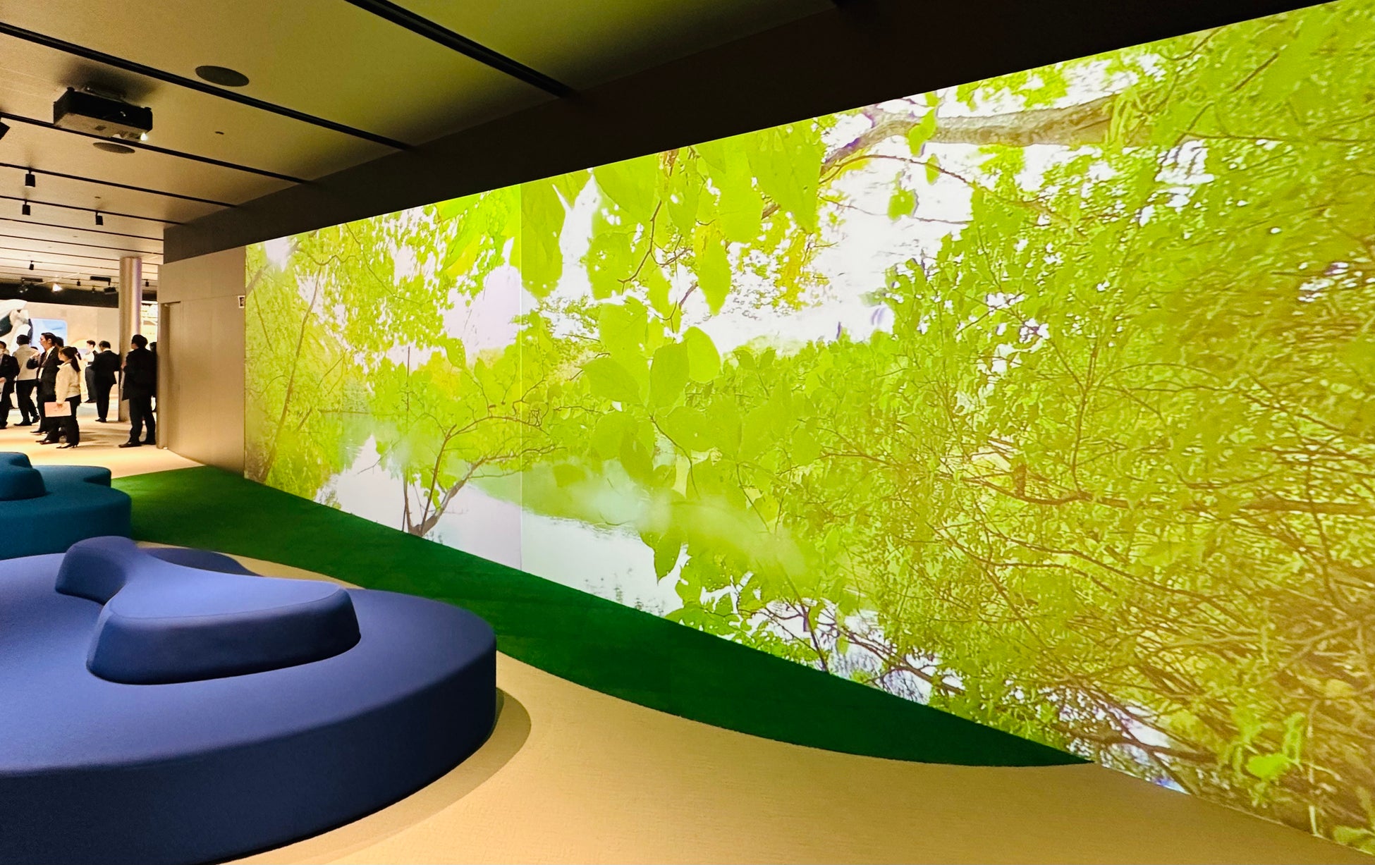 大阪ヘルスケアパビリオンの休憩スペースでは、北海道・十勝や大阪・箕面などの美しい自然映像と音に包まれ、来館者は視覚・聴覚から深い安らぎを得る“新しい休憩体験”を楽しむことができます。