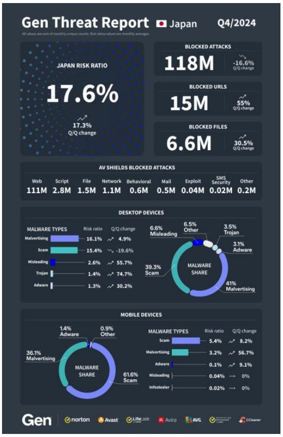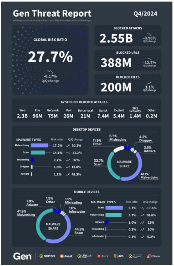 デジタルセキュリティのグローバルリーダーであるGenは、2024年第4四半期のAvast、Norton、AVG、Avira、LifeLockを含む多様なサイバーセキュリティブランドの脅威レポートを発表しました。
