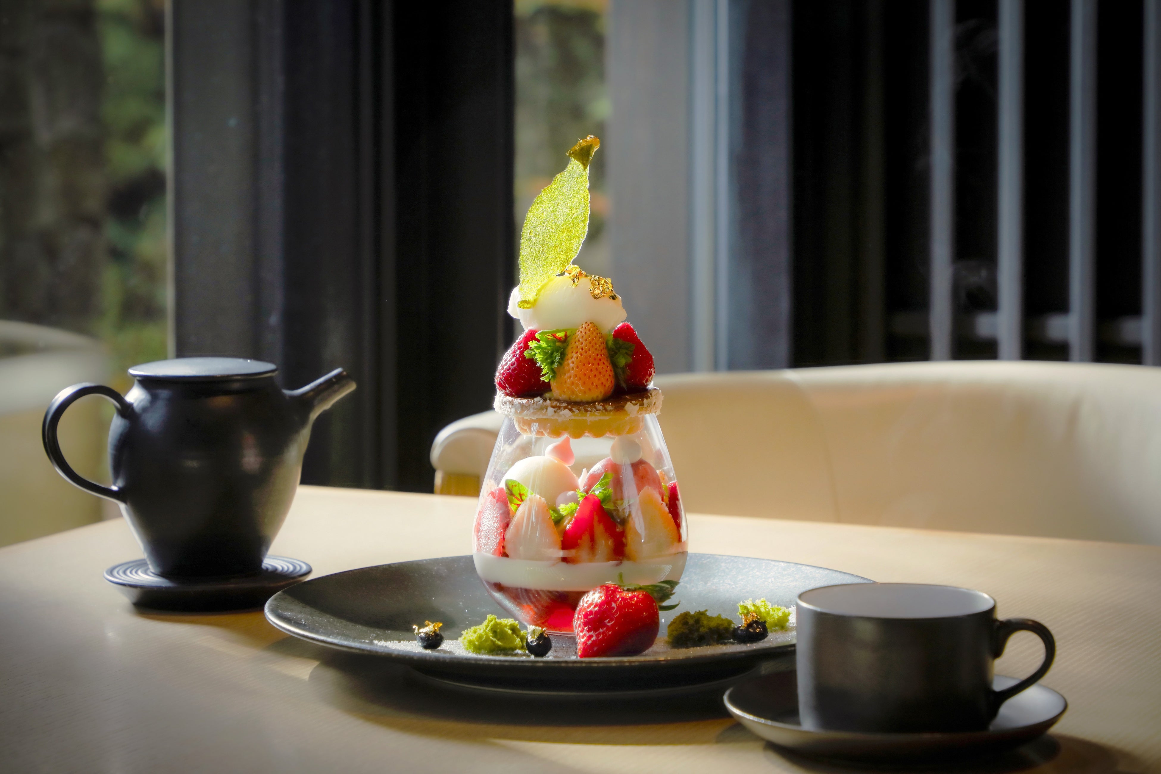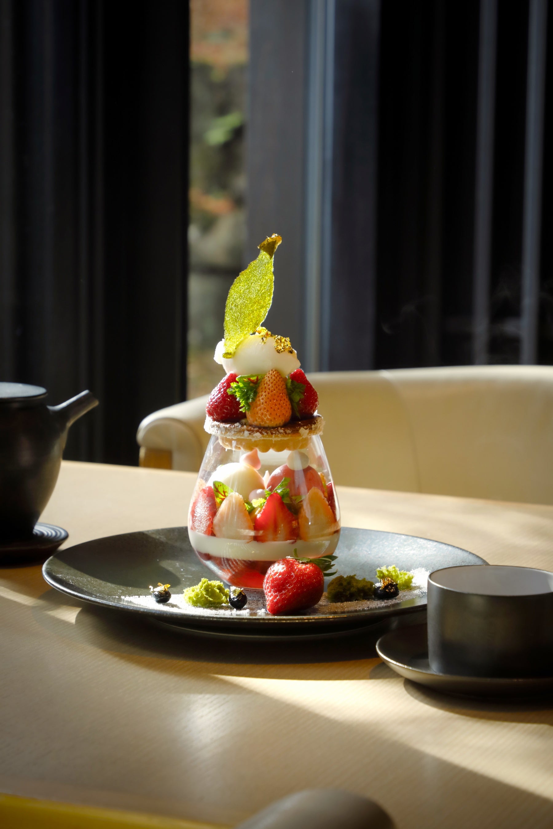 エグゼクティブ ペストリーシェフ 松尾浩幸が考案するデザートは、季節の移ろいを反映し、独創的で繊細な美しさで毎シーズン人気を博してきました。甘みが強く、ほのかにピンク色の淡雪と、甘さと酸味のバランスが絶妙なあまおうの2種のいちごをふんだんに使用し、フレッシュないちごのみならず、アイスクリームやジュレなどにアレンジ。グラスの器の中には食感や、フレーバーにこだわった見た目にも美しい京都のエレメントが散りばめられ、主役のいちごを引き立てます。