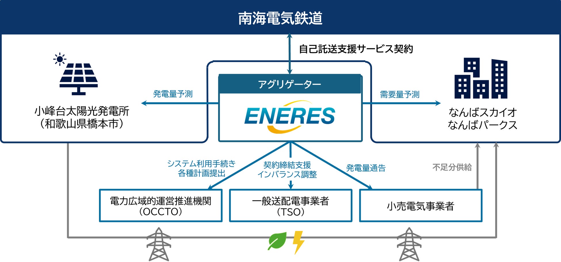 エナリスは、南海電鉄が自ら開発する和歌山県橋本市の太陽光発電所でつくった電力を、大阪市の「なんばスカイオ」および「なんばパークス」へ供給する自己託送を支援します。
