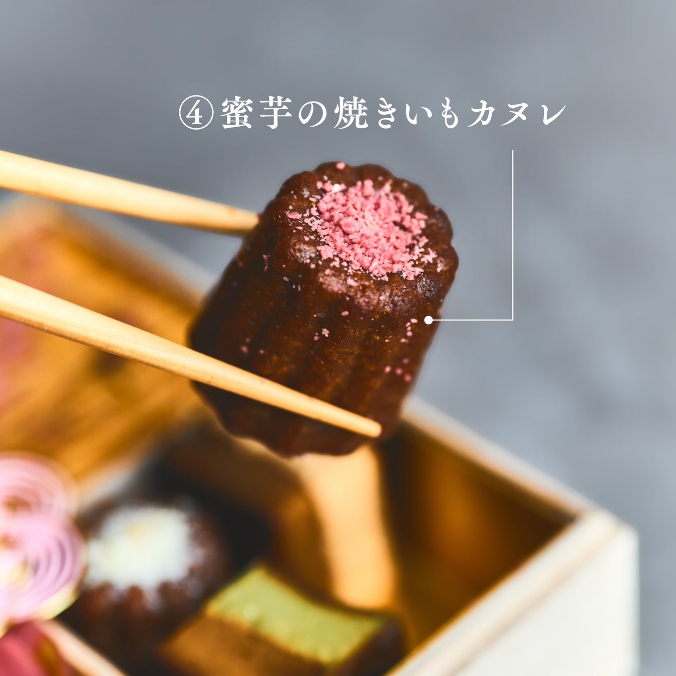 ④蜜芋の焼きいもカヌレ:五つ星ホテル「ザ・ペニンシュラ東京」のスイートルームでも採用されたカヌレ。カリッと香ばしく焼き上げた表面と、内側に閉じ込めた安納芋の焼きいもの甘み。フランス菓子の技法と蜜芋の魅力が出会った贅沢な味わいです。