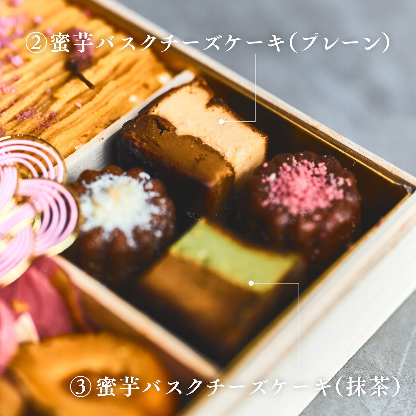 ②蜜芋バスクチーズケーキ(プレーン):Amazon洋菓子部門第1位を獲得した看板スイーツ。香ばしく焼き上げたバスクチーズケーキに、熟成炭火焼き安納芋のスイートポテトを重ねた二層仕立て。チーズのコクと蜜芋のやさしい甘みが溶け合う、& OIMO TOKYOならではのバスクチーズケーキです。
