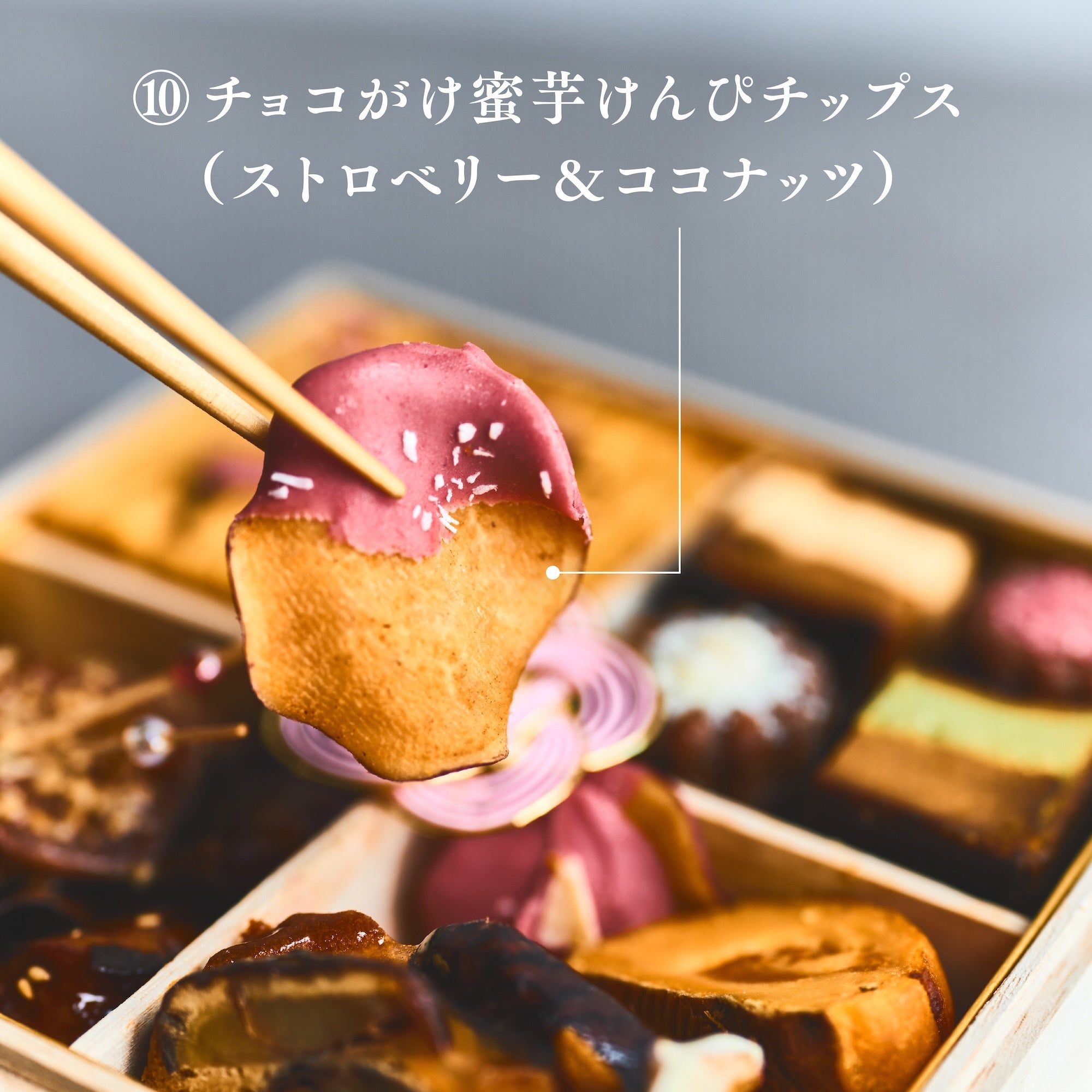 ⑩チョコがけ蜜芋けんぴチップス(ストロベリー&ココナッツ):蜜芋けんぴチップスをストロベリーチョコレートで包み込み、ココナッツの香ばしい食感をアクセントに。甘みと酸味のバランスが心地よいスイーツです。