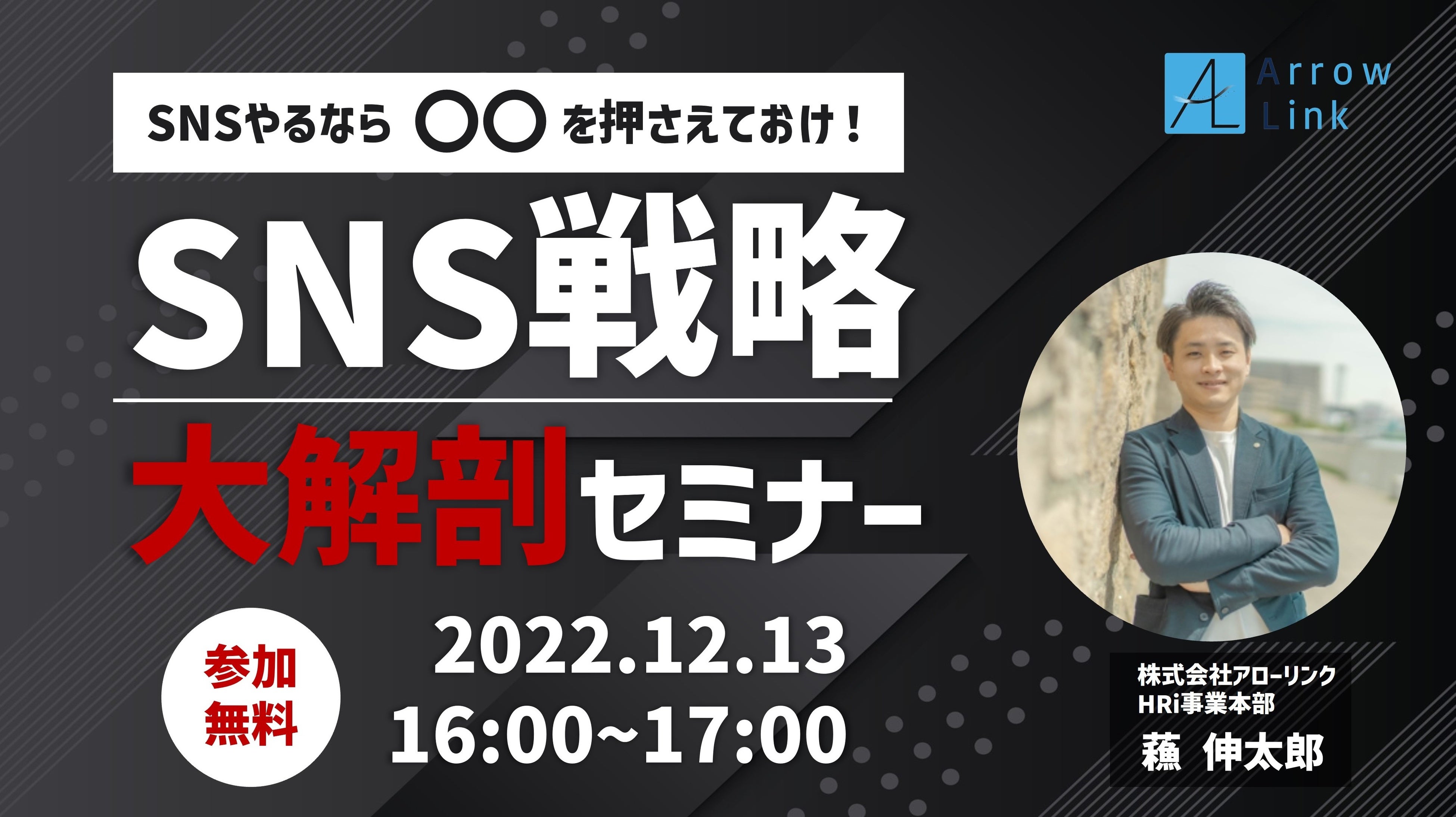 株式会社アローリンク(本社:兵庫県神戸市、代表取締役:蓬莱和真)は、12/13(火)にSNS採用実施企業様向けのオンラインセミナーを無料で開催します。「SNSやるなら〇〇を押さえておけ!SNS戦略大解剖セミナー!」と題し、コロナ禍に最適な"SNSを活用した採用戦略"について詳しくお伝えします。