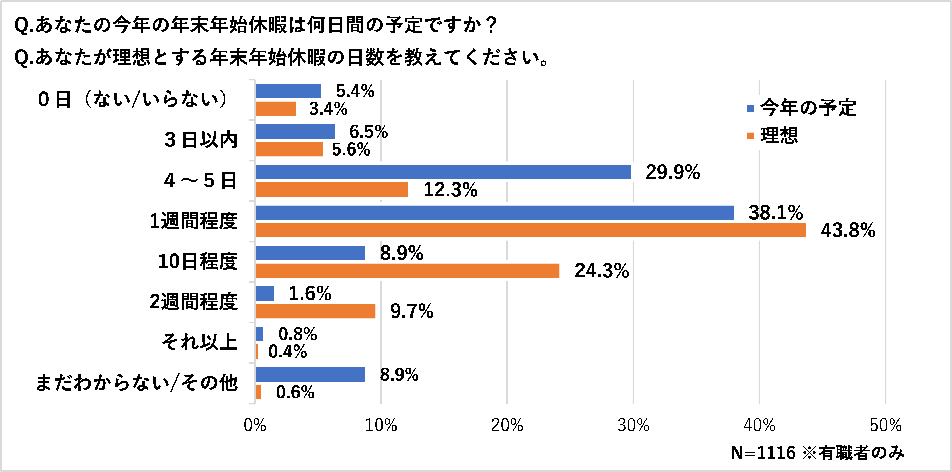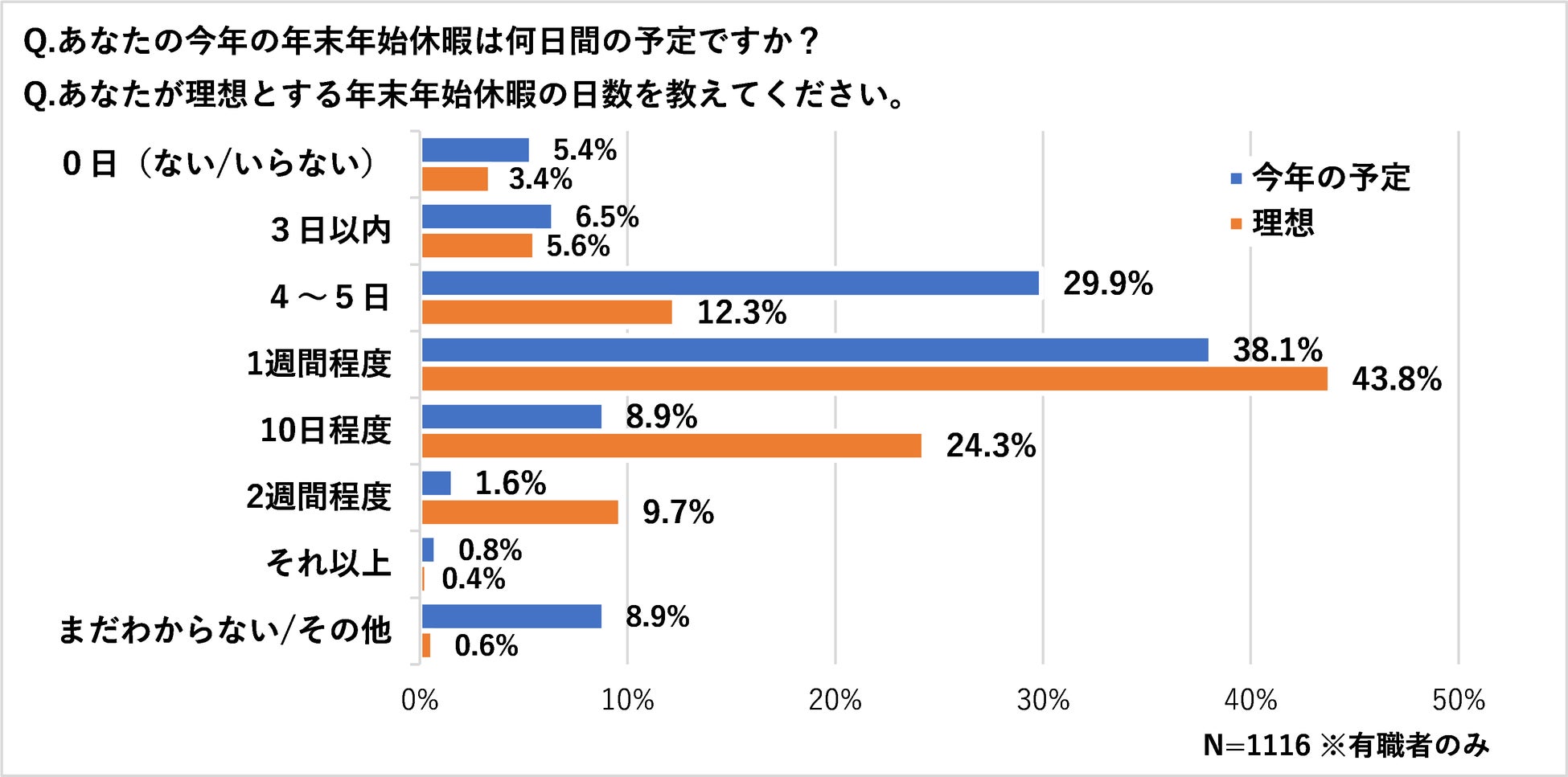 年末年始休暇の予定は4~7日程度で約7割、理想の日数は7~10日程度と実態より少し長め