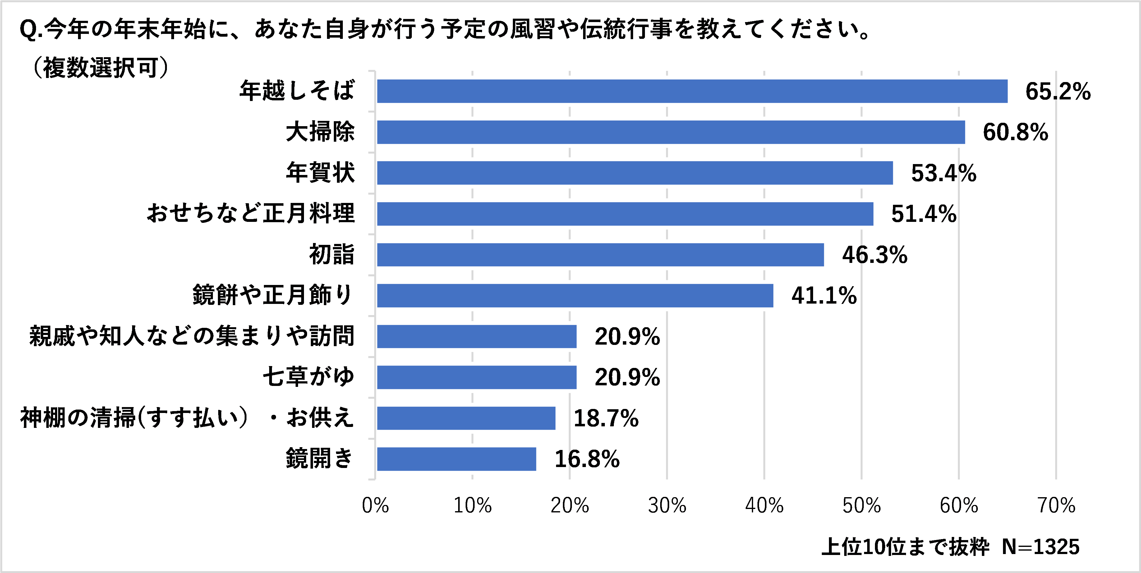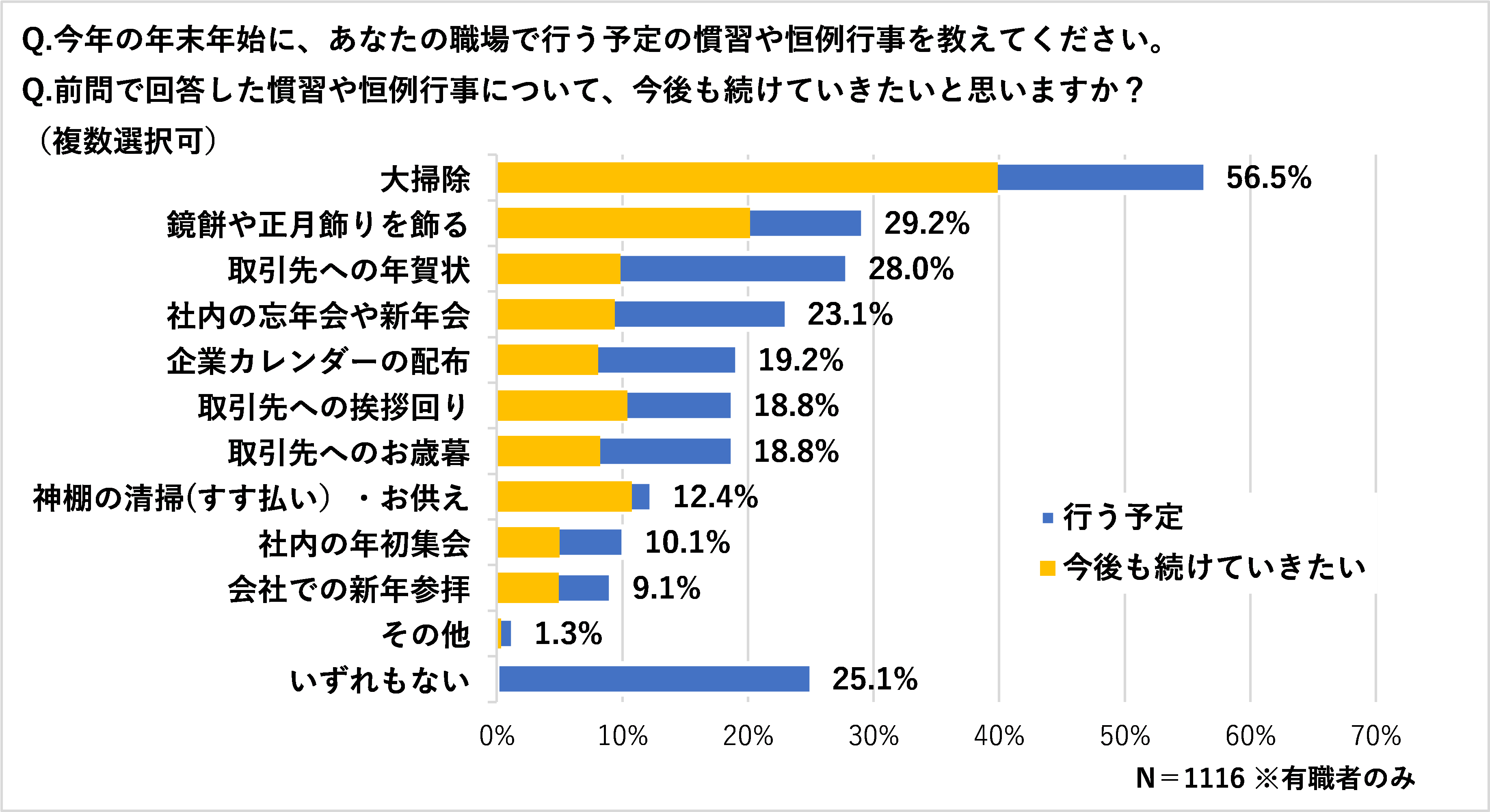 ・職場で年末年始に行う予定は、「大掃除」「鏡餅やお正月飾りを飾る」「取引先への年賀状」。