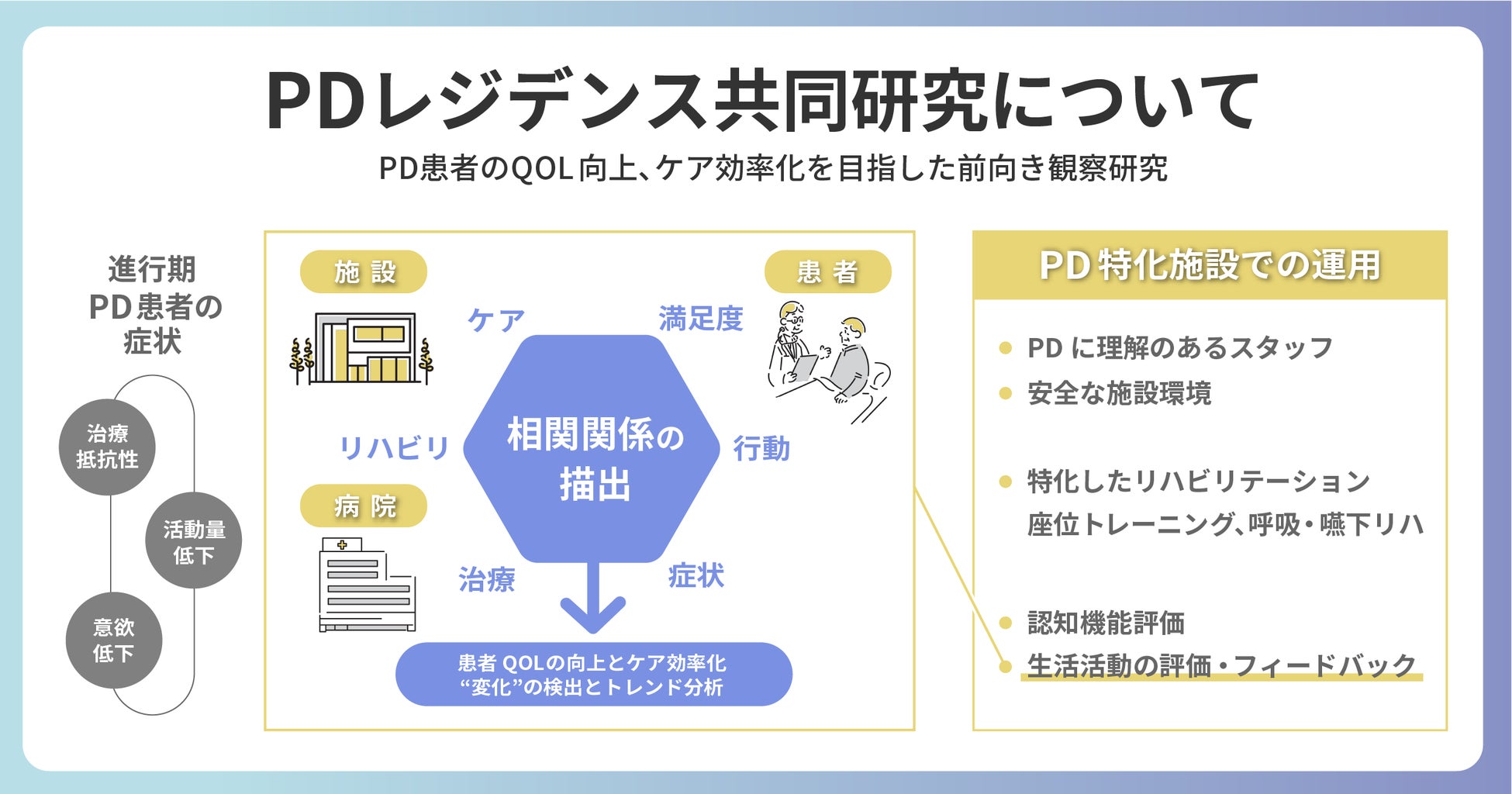 この研究は、施設入所患者およびコミュニティ在住患者の療養生活における生活の質(QOL)向上および日常生活動作(ADL)の維持に重要な因子を明らかにすることを目的としています。フィロソフィアが運営するPD特化型住宅型有料老人ホーム「PDレジデンス」と協力し、患者のQOL向上を図るだけでなく、高齢化社会における介護リソースの効率化と集約という観点から、進行期のPD患者に対する最適なケアプランのモデルケースを地域社会に提供することを目指します。