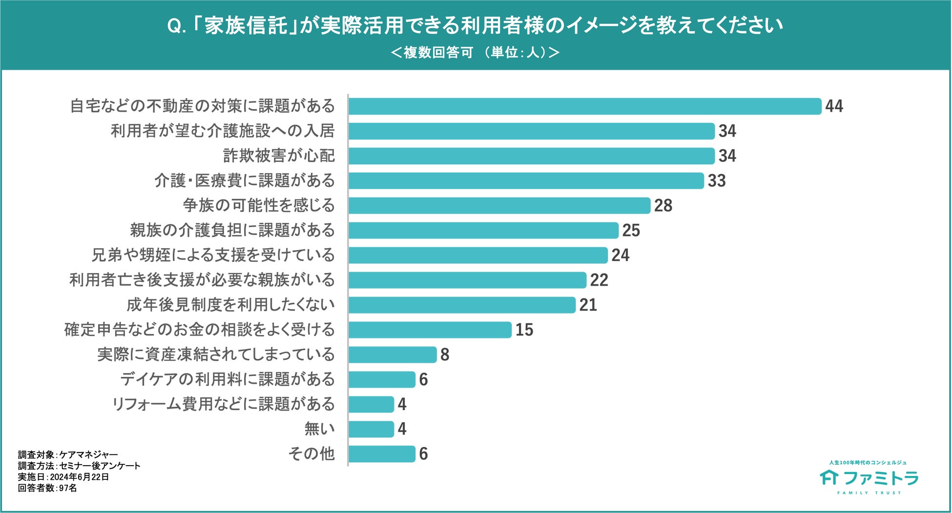家族信託サービスを提供する株式会社ファミトラ(所在地:東京都港区、代表取締役CEO:三橋克仁、以下ファミトラ)は、利用者とそのご家族の一番近くで、日々の生活をサポートをしているケアマネジャーを対象とした「福祉と医療を、金融の面から支える”家族信託”の活用について」をテーマとするセミナーでアンケート(有効回答数:97人)を実施しました。