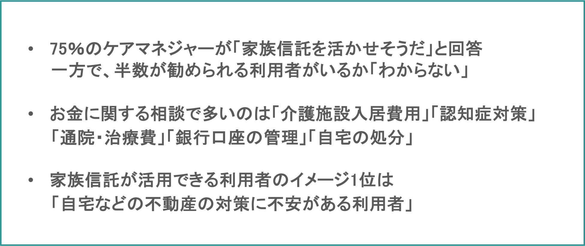 介護の仕事に従事するケアマネジャー(介護支援専門員)は、全国に約18万人(*1)おり、日々、利用者とその家族を支える重要な役割を担っています。アンケートでは、家族信託の活用に関する高い関心が示された一方で、利用者の経済的な不安解消に向けた課題が浮き彫りになりました。