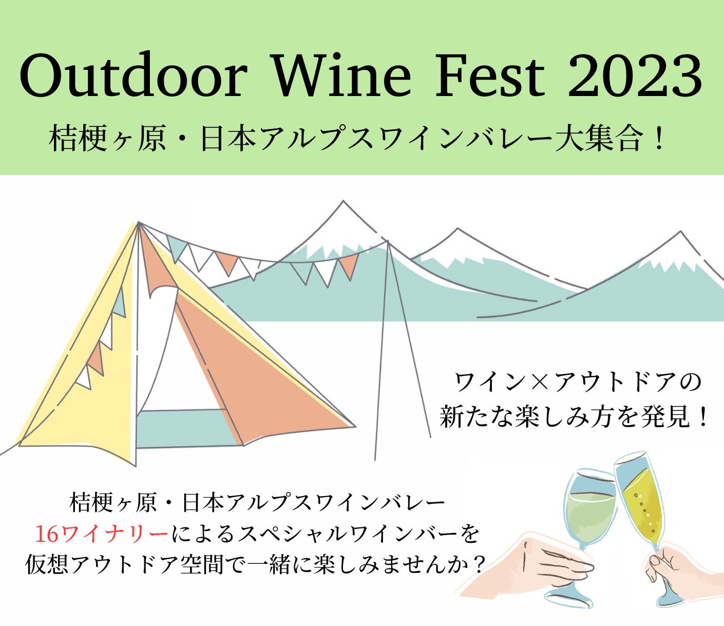 Outdoor Wine Fest 2023 実行委員会 (松本市、安曇野市、大町市、池田町、山形村、塩尻市、株式会社エイアンドエフ)は、桔梗ヶ原・日本アルプスワインバレーの地域内における、ワインの魅力の PR と消費拡大を目的としたワインイベントを開催します。