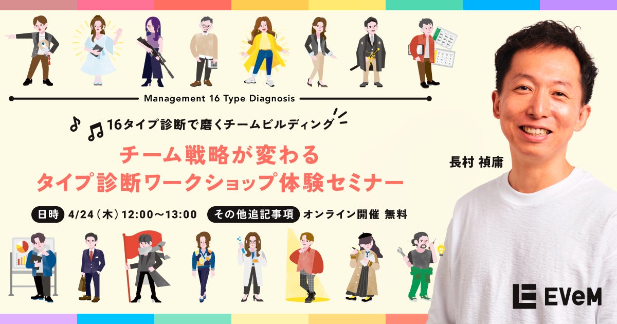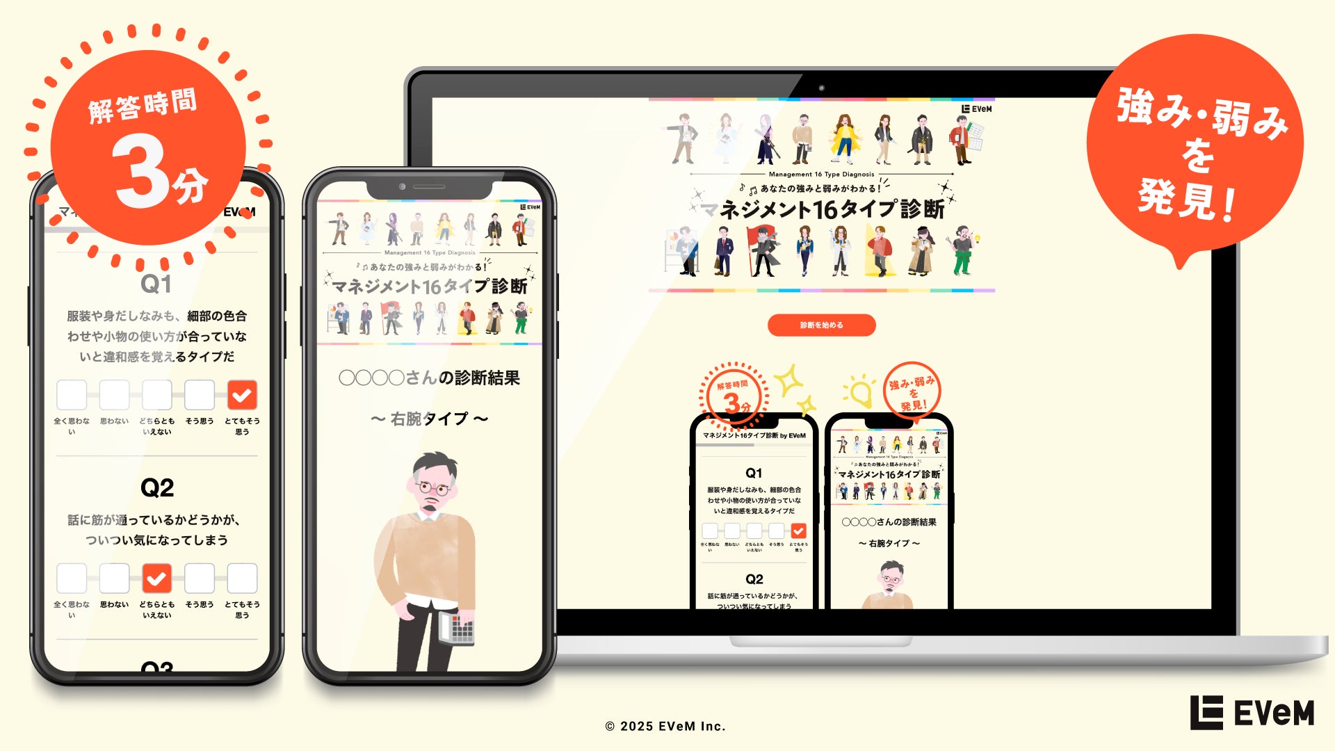 マネージャーイネーブルメントサービスを提供する株式会社EVeM(本社:東京都新宿区、代表取締役:長村 禎庸)は、管理職・マネージャー向けのタイプ診断テスト「マネジメント16タイプ診断」を公開しました。