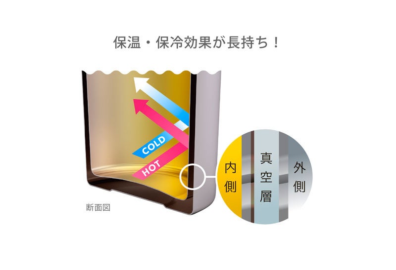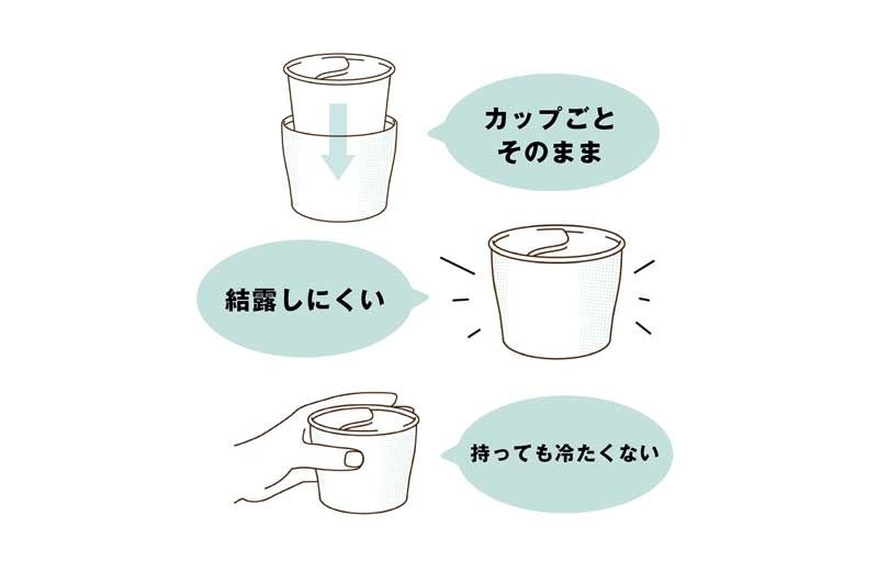 真空二重構造なので、手から伝わる熱を防ぎ美味しくゆっくりアイスを楽しむことができます。カップを持っても手が冷たくならず、また、結露しにくいので手が濡れません。