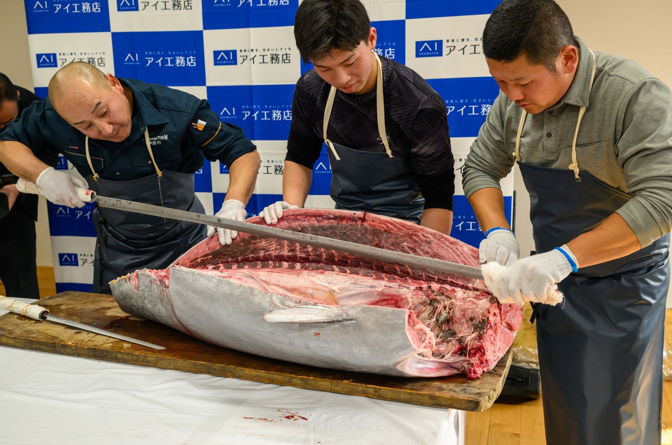アイ工務店から二所ノ関親方へ初競りまぐろの進呈、まぐろの解体 等