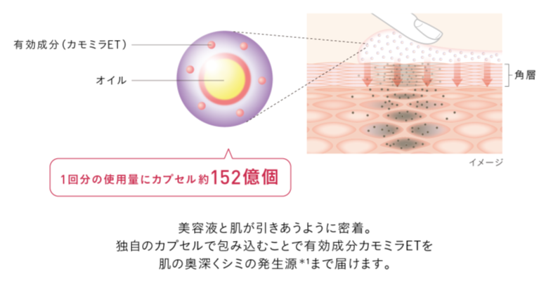 オイルと有効成分(カモミラET)を包み込んだ独⾃のカプセルが1 回の使⽤量に約152 億個※4 含まれています。カプセルにすることでカモミラETを肌の奥深くシミの発⽣源※1まで届けます。(イルミネイティングセラムのみ)