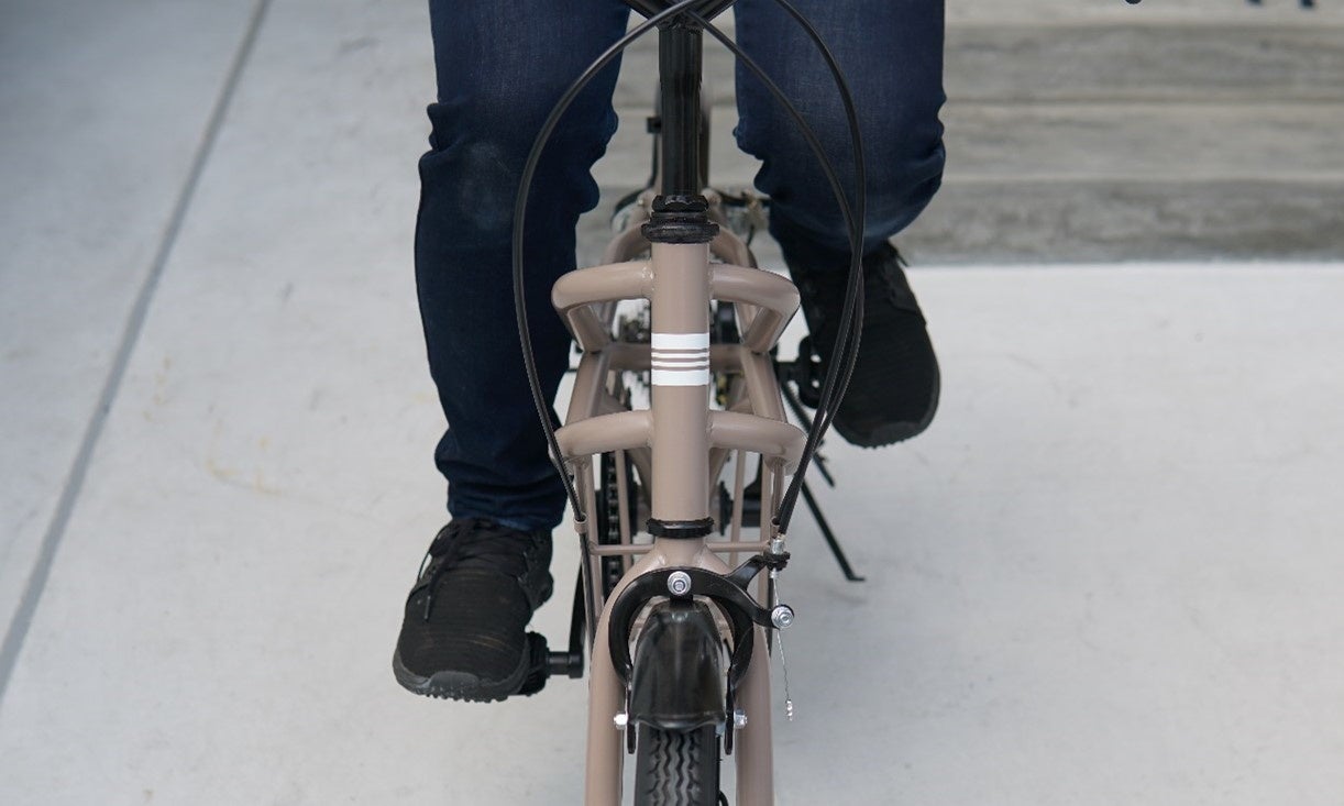 大きなバスケット容量を確保しつつもペダルを漕ぐ姿勢を考え、前を広く、後ろを細くして膝やふくらはぎがフレームにぶつかりにくいように設計。自転車としての基本機能を損なうことなく、新しい機能を付加することに成功しました。