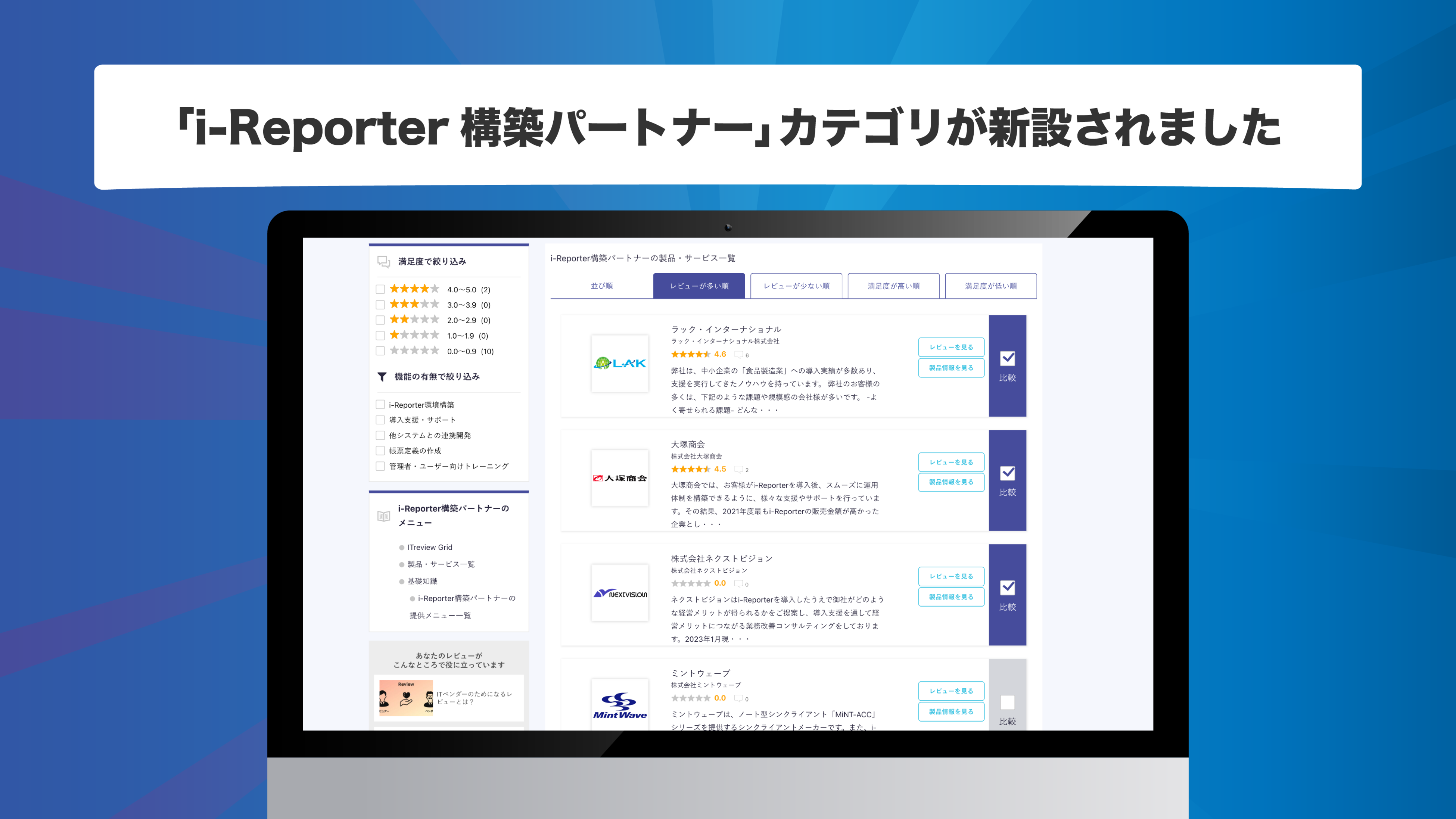 国内最大級のIT製品・SaaSレビューサイトで、i-Reporter構築パートナーの支援メニューやレビューが閲覧可能に
