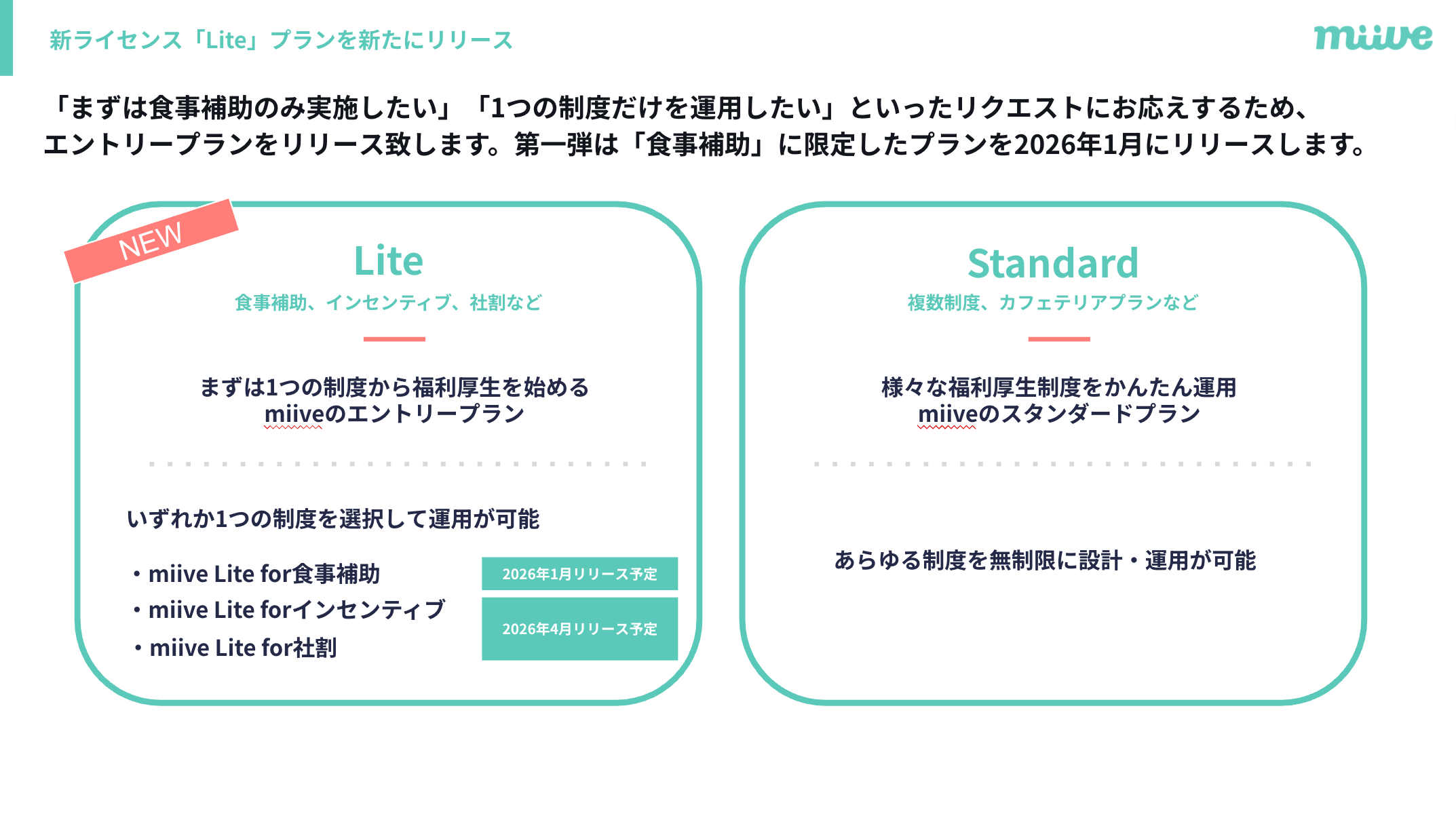 2026年1月に第一弾の「miive 食事補助」、2026年4月には「miive インセンティブ」「miive 社割」の3つのプランをリリース予定です。