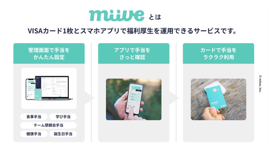 『miive』は、Visaカードとアプリを活用した全国・全世界でご利用いただけるポイント型の新しい福利厚生プラットフォームです。企業は、利用できるお店や使い方を設定してポイントを付与し、従業員は専用カードで決済するだけでポイントを利用できます。拠点格差のない福利厚生の実現や既存手当の見直し、採用・定着における他社との差別化や、インフレに伴う従業員への還元強化など、さまざまな課題解決をサポートしています。
