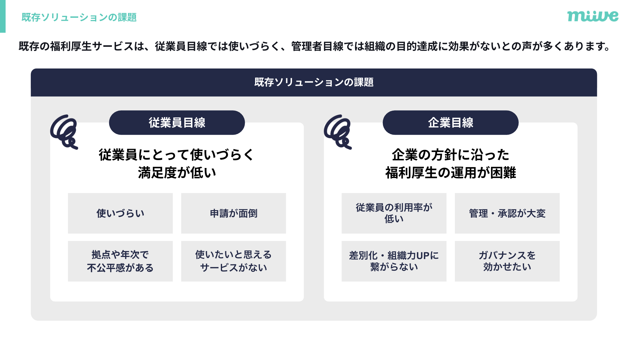 ②従来の福利厚生課題:従業員目線では使いづらく、管理者目線では人事的打ち手に繋がりづらい