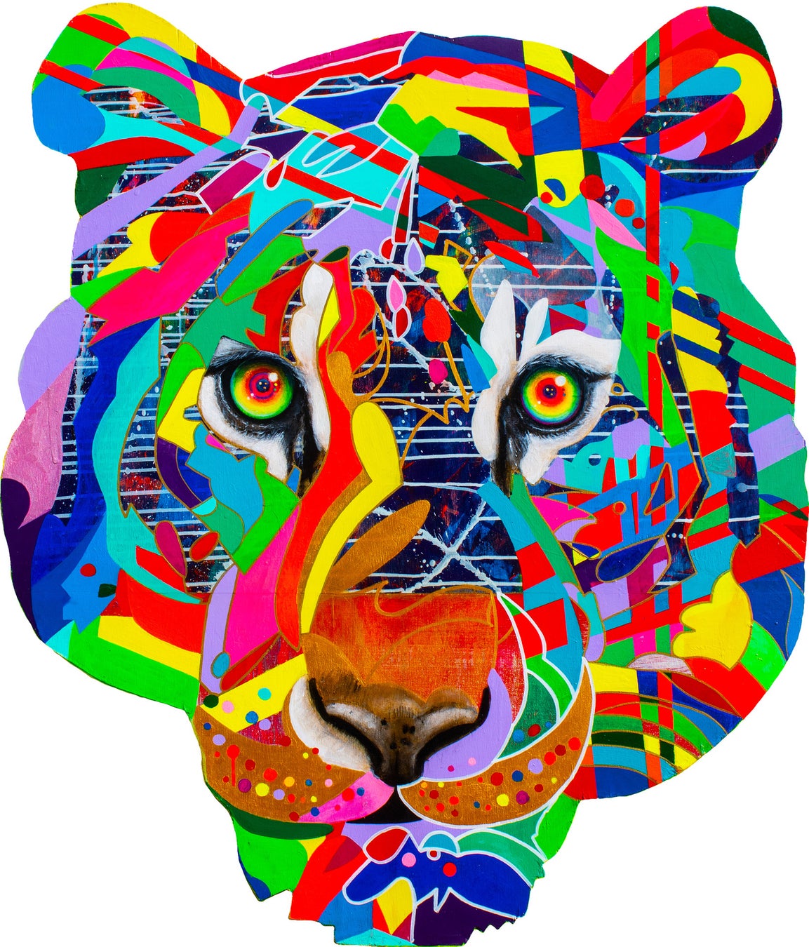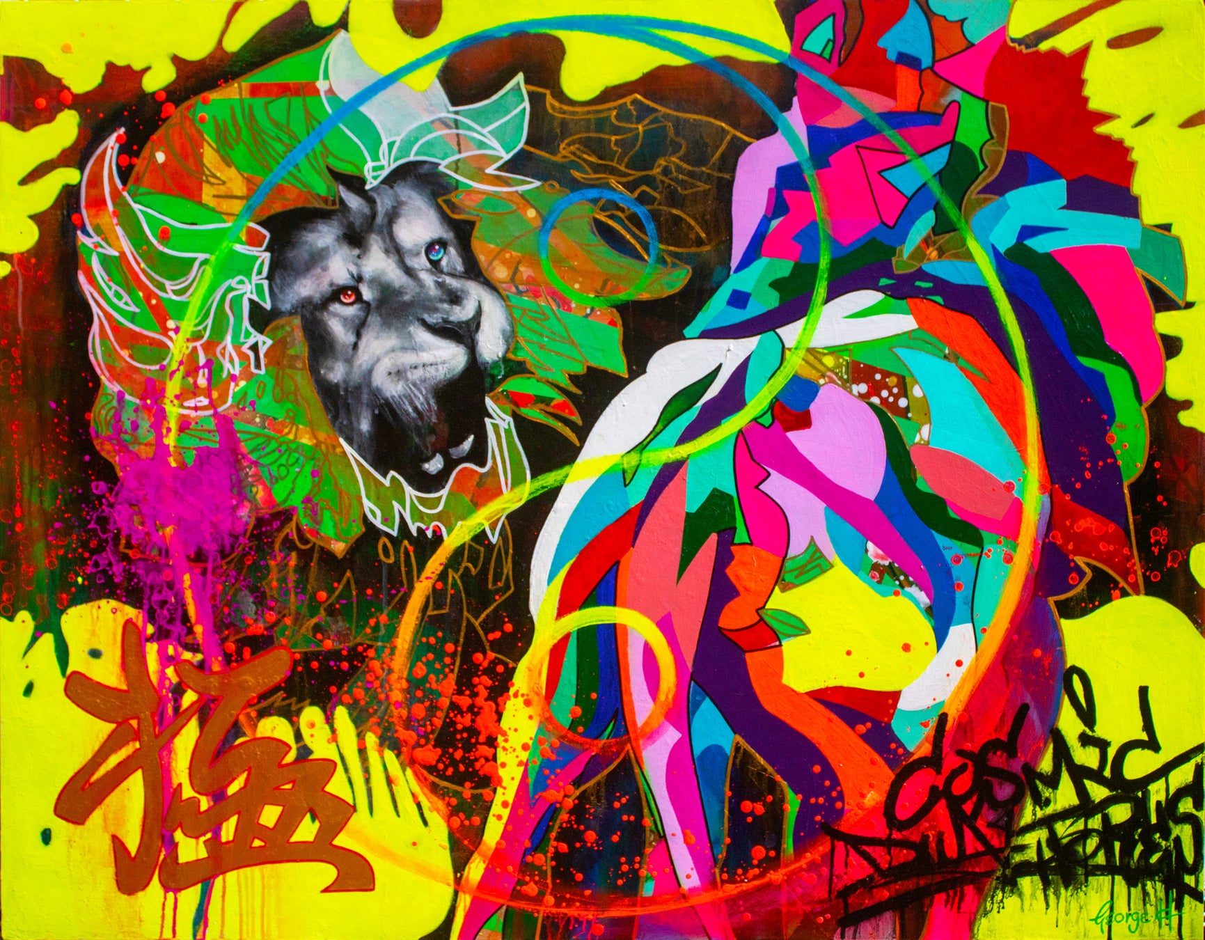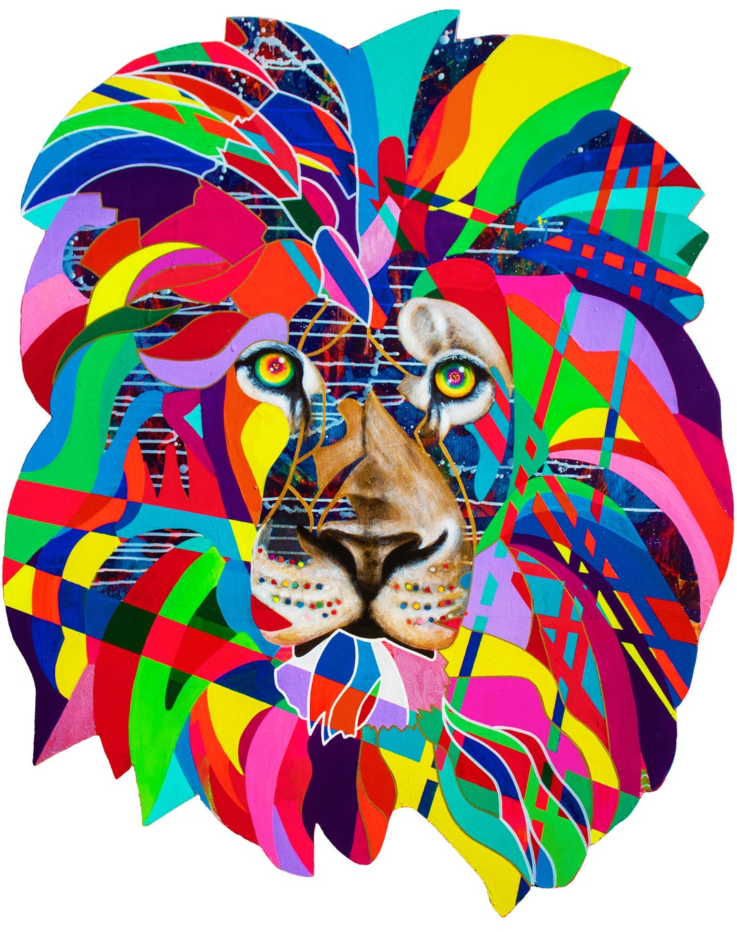 ハヤシは自然が持つエネルギー、野生動物の本能や生き方に惹かれ「NOMAD HEART/自由な心」を信条とし、作品を制作しています。ライオンをモチーフとして頻繁に描くのは、縄張りをもたず、生きやすい場所へと移住しながら仲間を増やしていく生き方に共感してのこと。それは、おのおのが狭い範囲での同一性に囚われることなく、集権的な中央から逃れる遊牧民(ノマド)のシンボルとして置かれています。