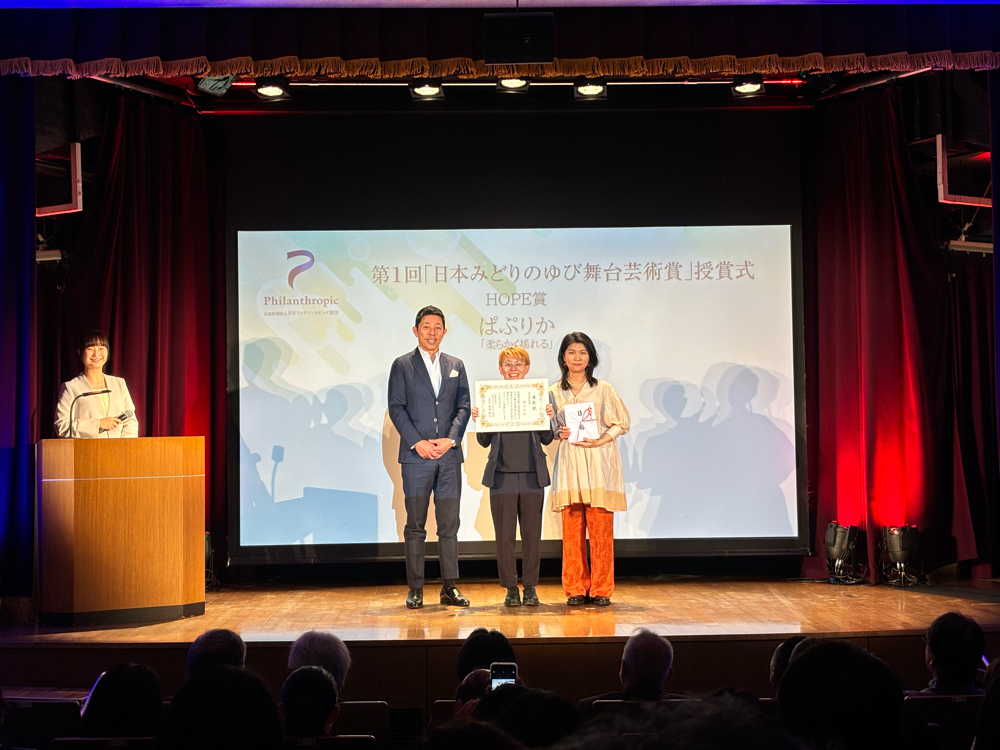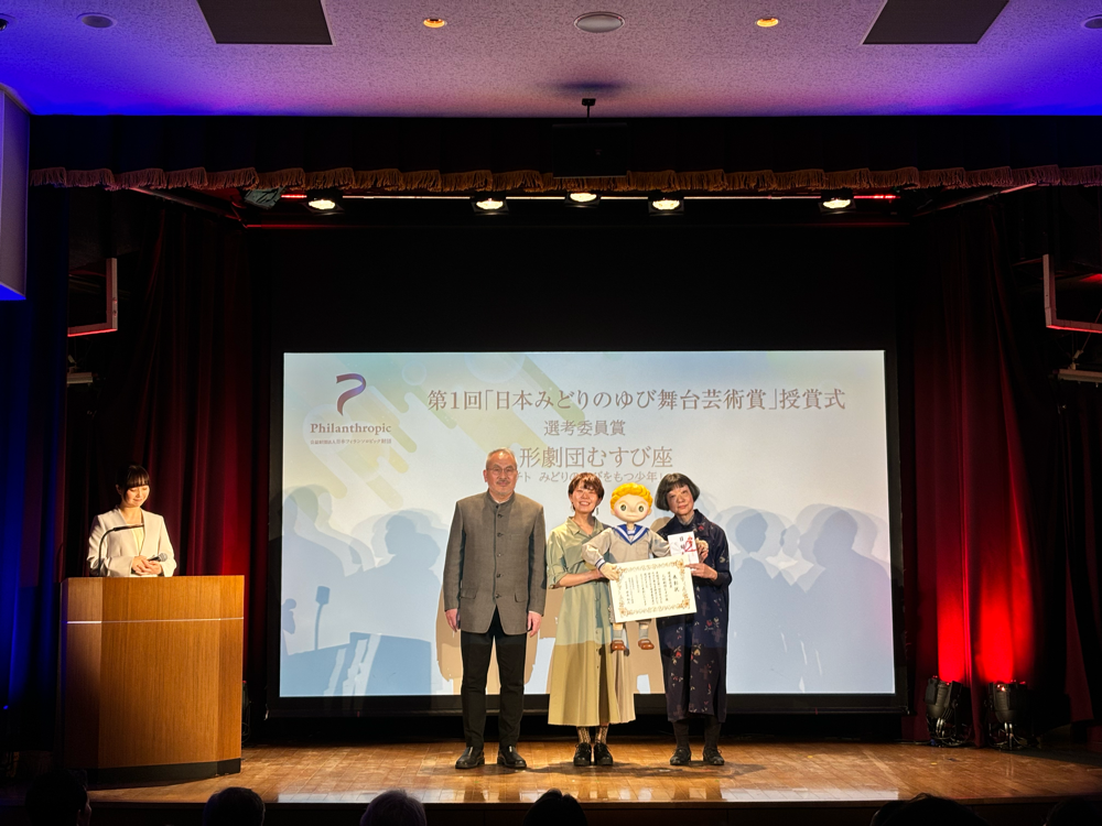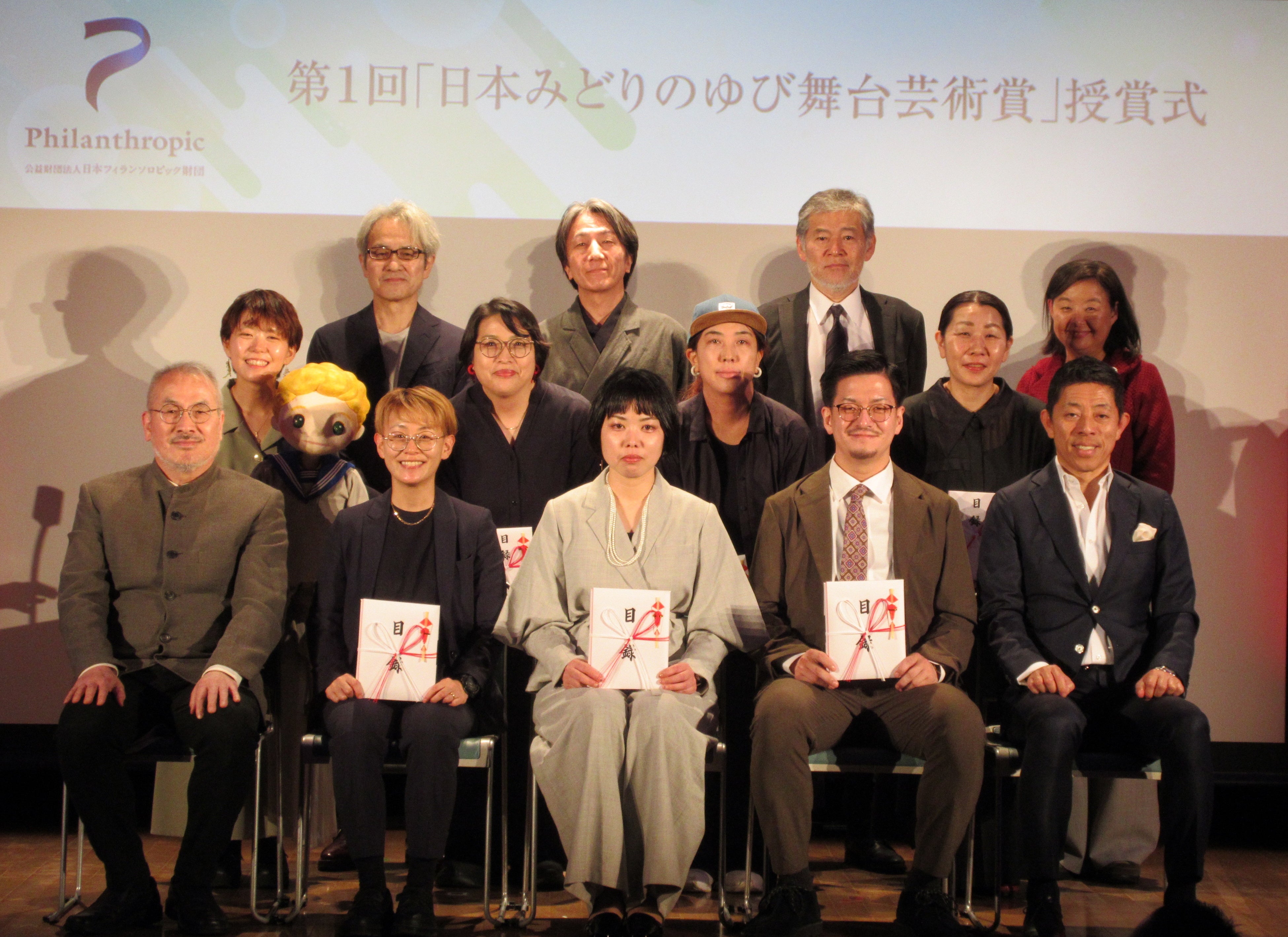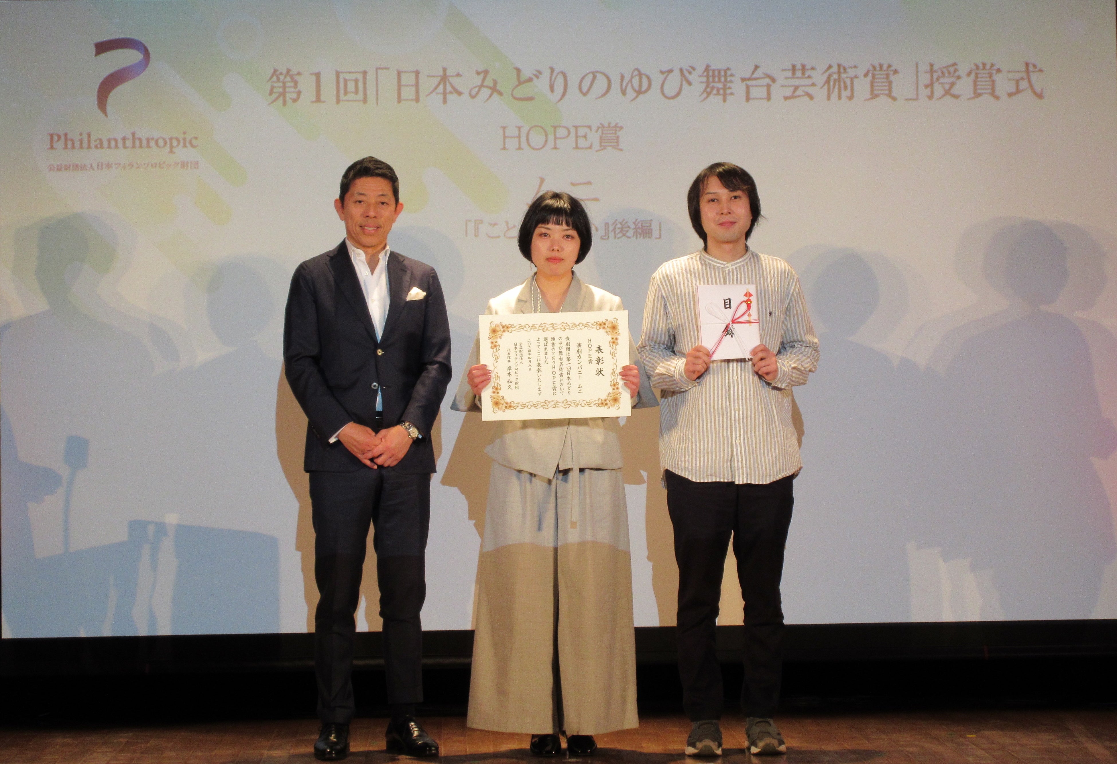 公益財団法人日本フィランソロピック財団は、2024年4月8日、東京都内で、第1回「日本みどりのゆび舞台芸術賞」の授賞式を開催、受賞した劇団関係者、選考委員、財団関係者など約70名が見守るなか、受賞劇団の代表者へ賞状と目録が手渡されました。受賞したのは7劇団でした。HOPE賞を受賞したのは「ぱぷりか」、「ムニ」、「劇団不労社」、選考委員賞を受賞したのは「人形劇団むすび座」、「空晴」、「stamp/トリコ・A」、「タテヨコ企画」。