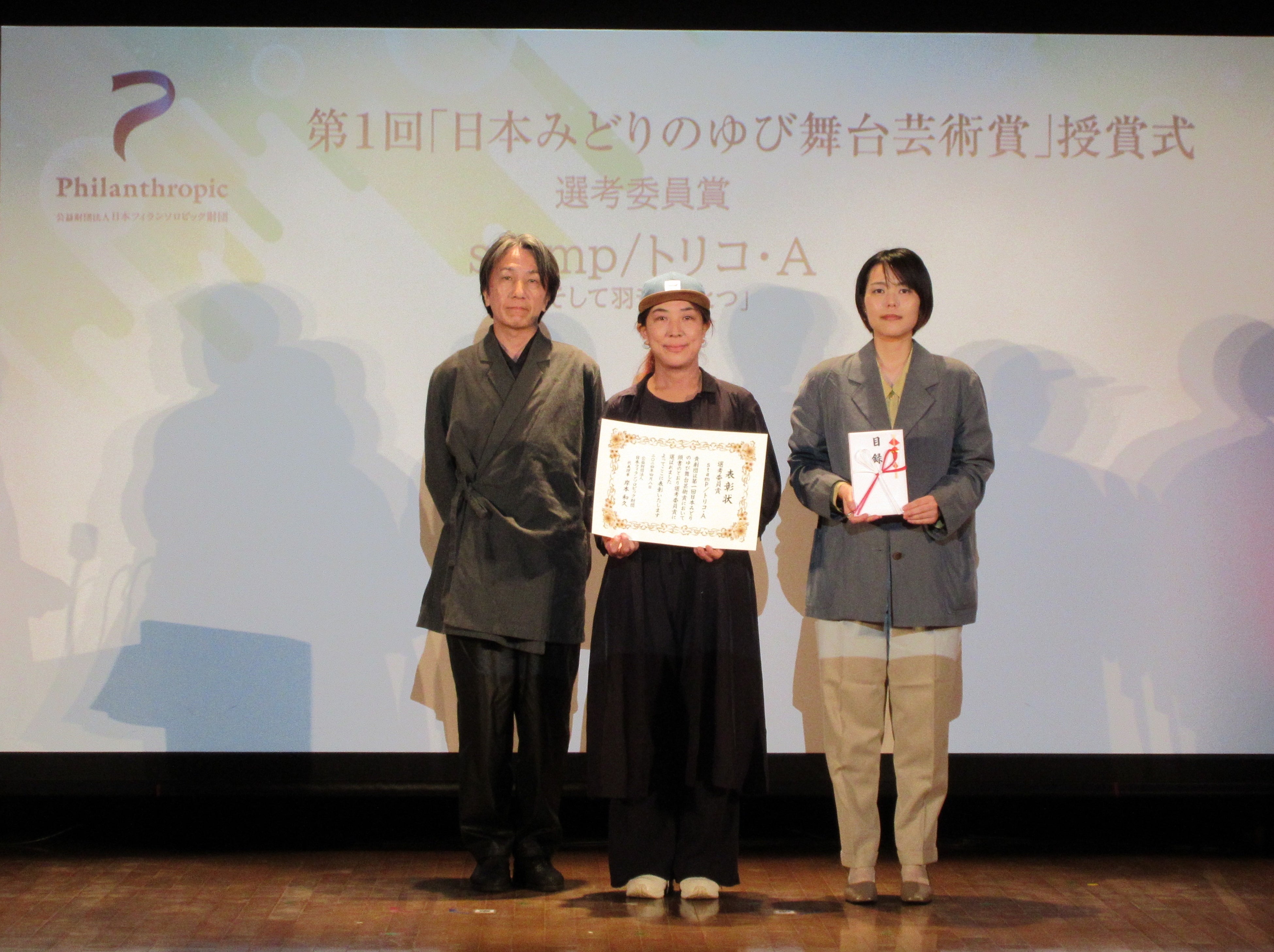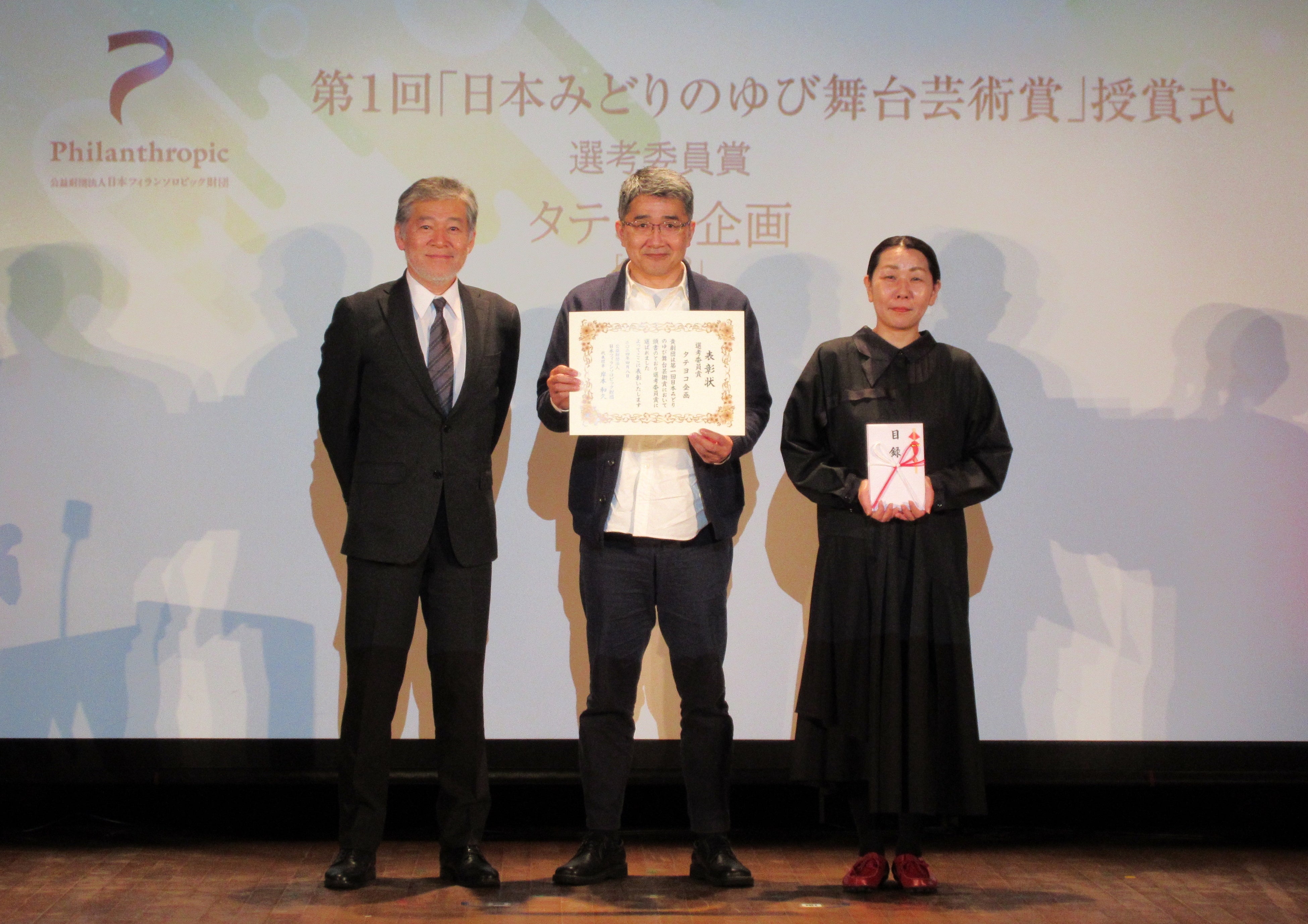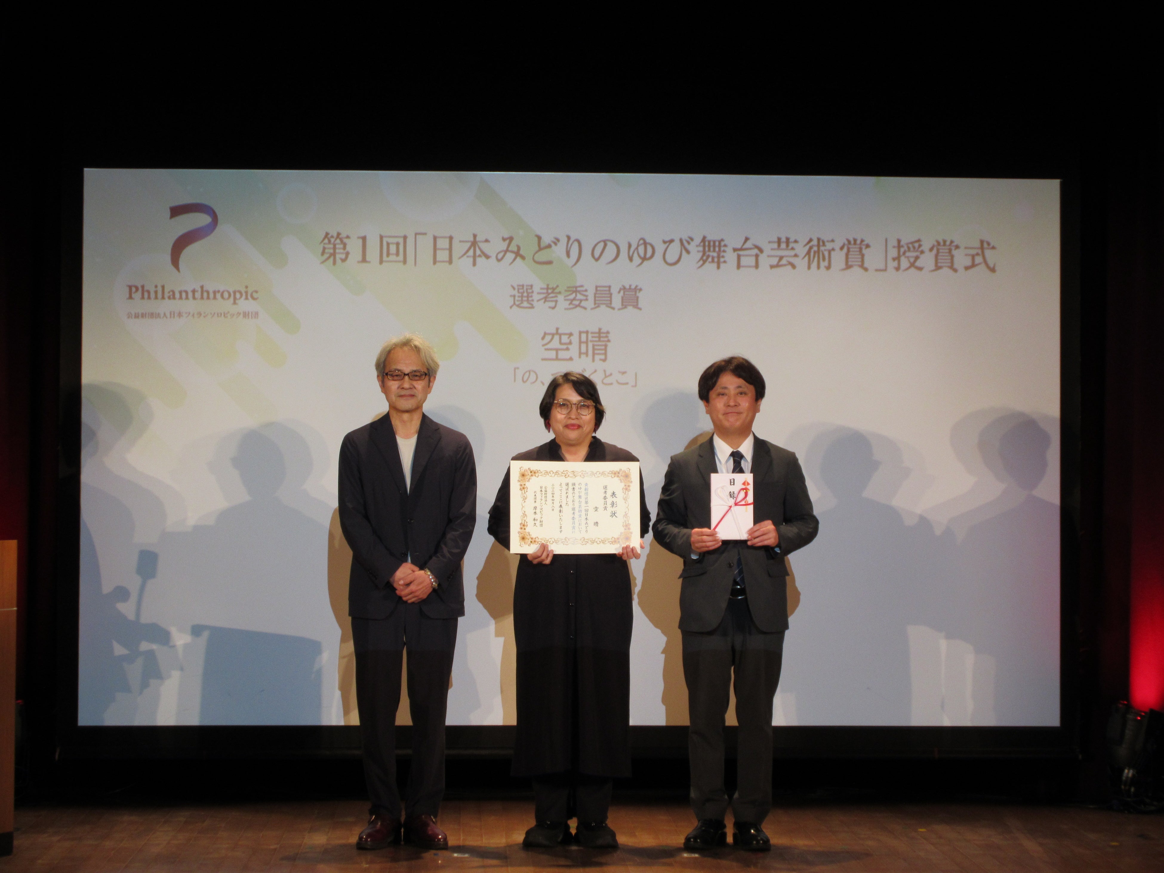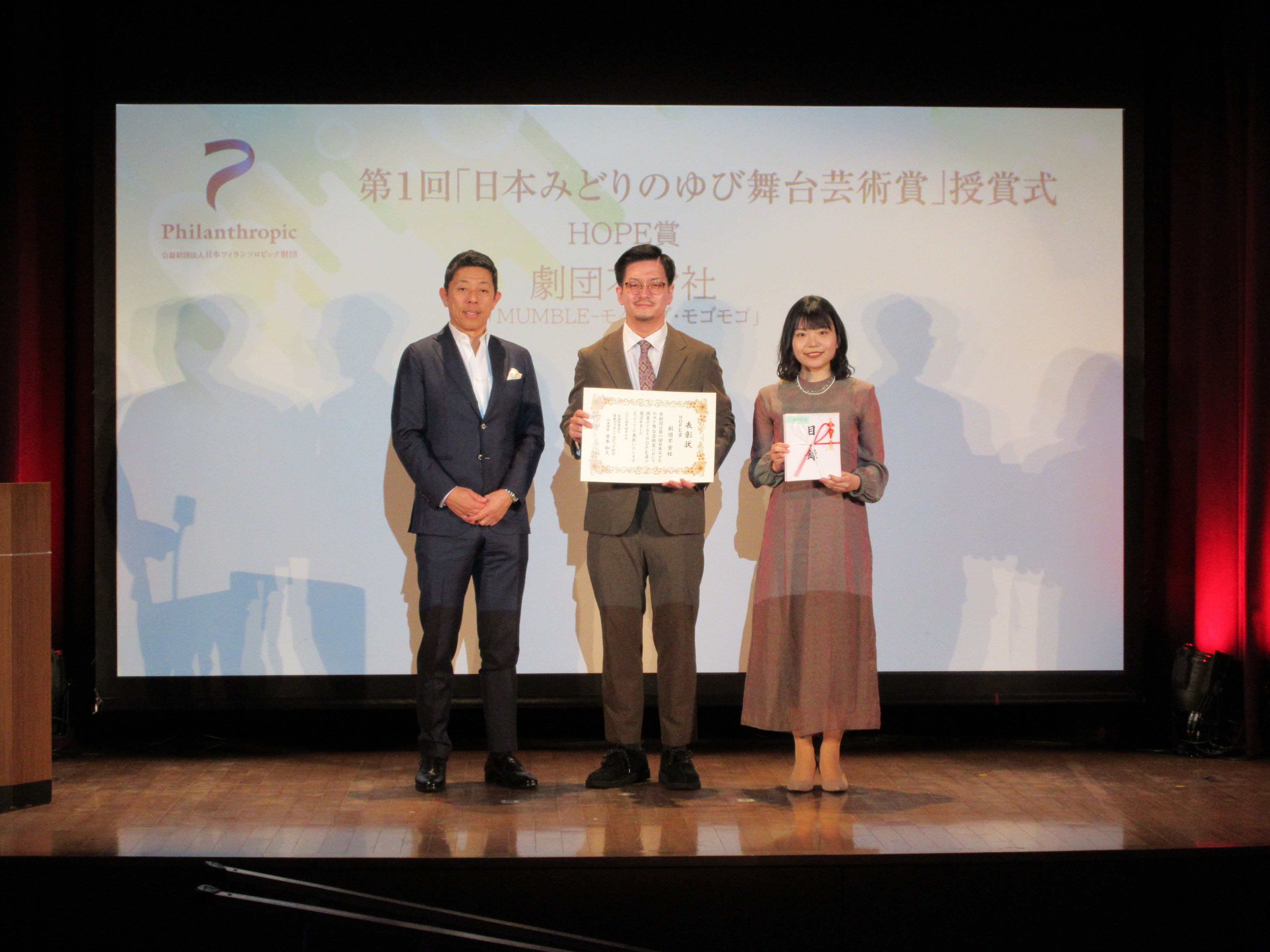 公益財団法人日本フィランソロピック財団は、2024年4月8日、東京都内で、第1回「日本みどりのゆび舞台芸術賞」の授賞式を開催、受賞した劇団関係者、選考委員、財団関係者など約70名が見守るなか、受賞劇団の代表者へ賞状と目録が手渡されました。受賞したのは7劇団でした。HOPE賞を受賞したのは「ぱぷりか」、「ムニ」、「劇団不労社」、選考委員賞を受賞したのは「人形劇団むすび座」、「空晴」、「stamp/トリコ・A」、「タテヨコ企画」。