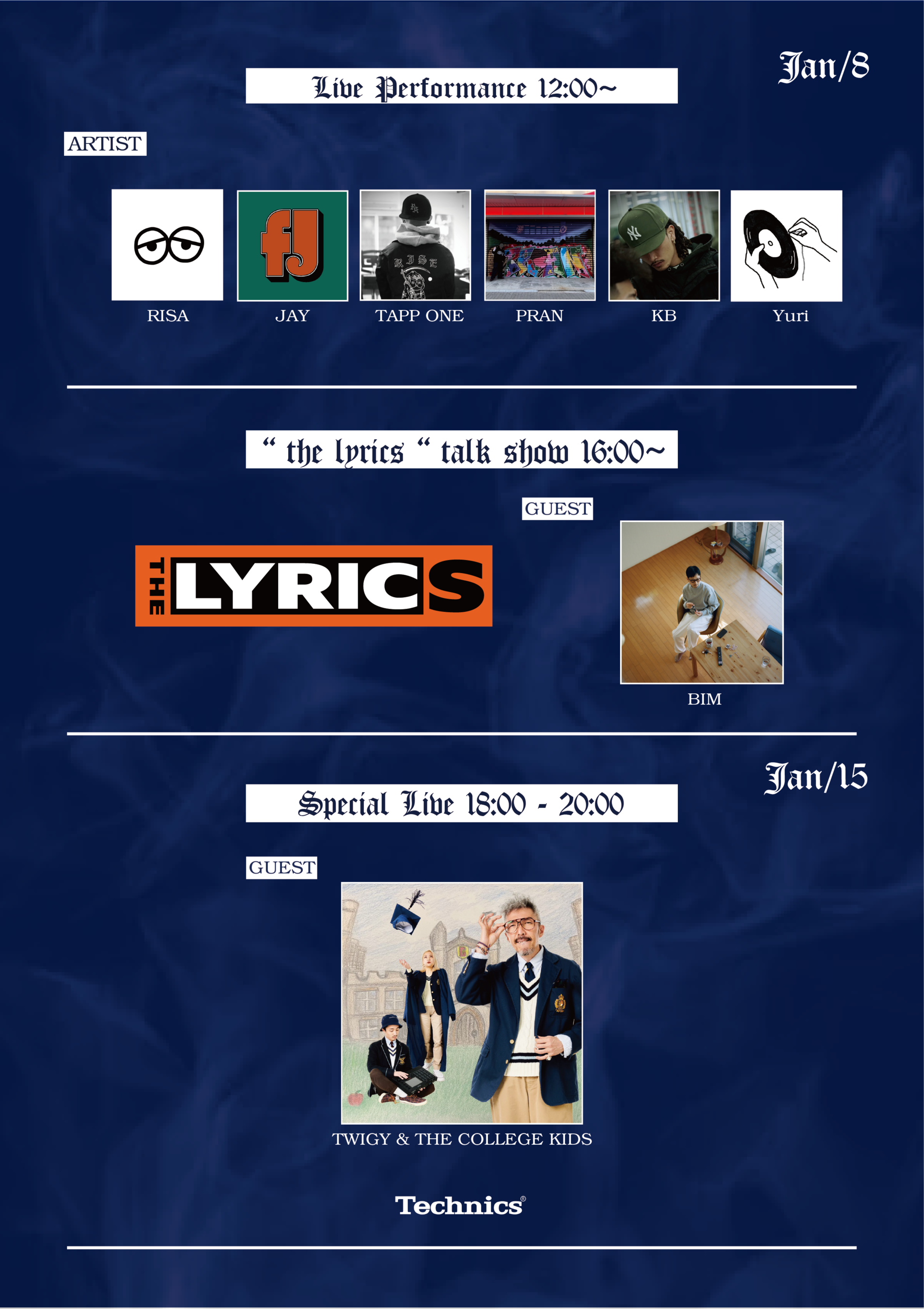 イベント最終日には、千秋楽にふさわしいコンテンツとして日本HIPHOP界のレジェンドTWIGYが自身のバンド「THE COLLEGE KIDS」として参加。ライブパフォーマンスでイベントを締めくくる。2022年に8年ぶりとなるニューアルバムを発売し注目度が高まる中、新年最初のライブとなる本イベントにぜひご注目ください。