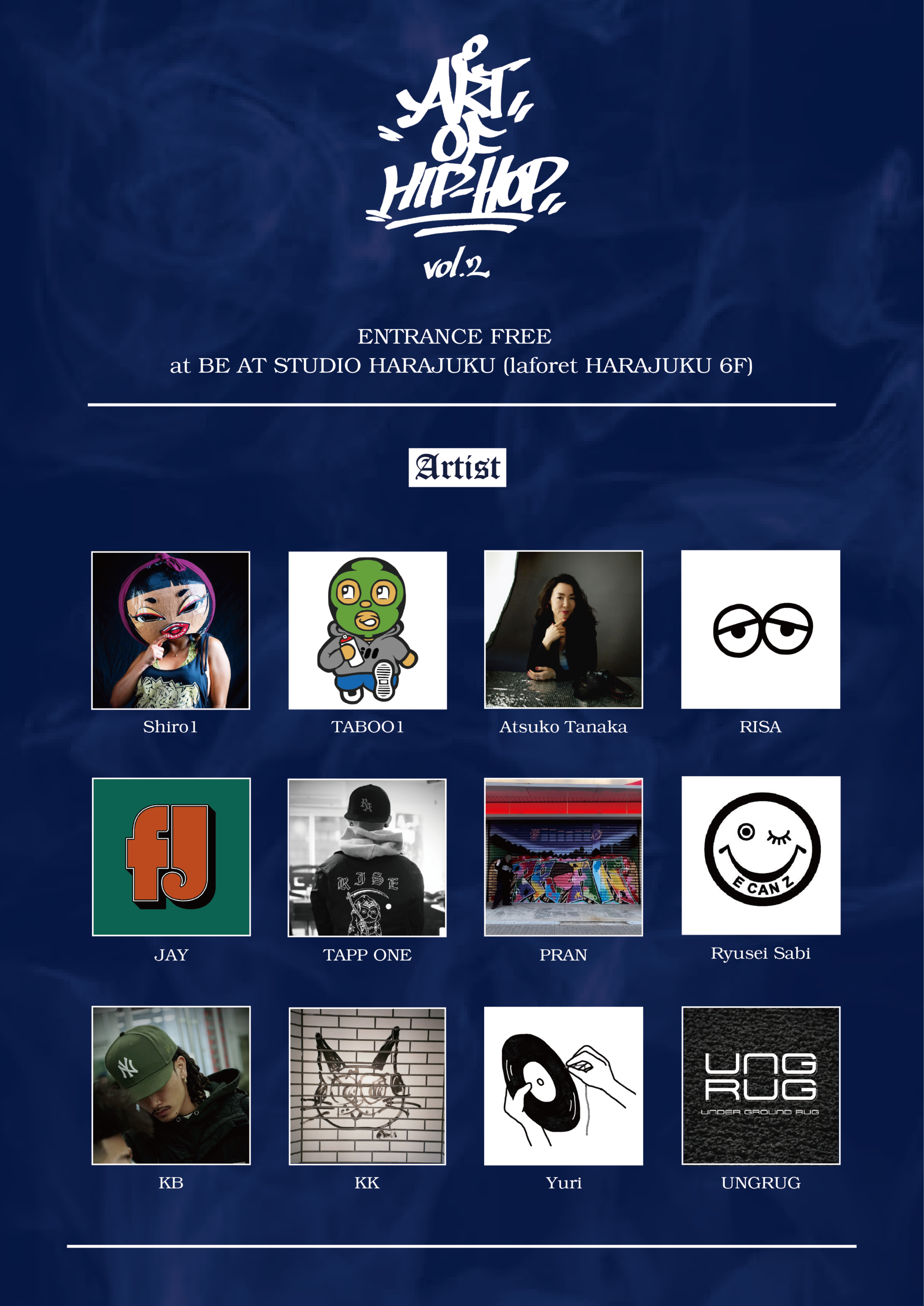 【参加アーティスト(全日程開催)】Shiro1、TABOO1、Yuri、UNGRUG、KK、Ryusei Sabi、Atsuko Tanaka、RISA、KB、PRAN、JAY、TAPP ONE