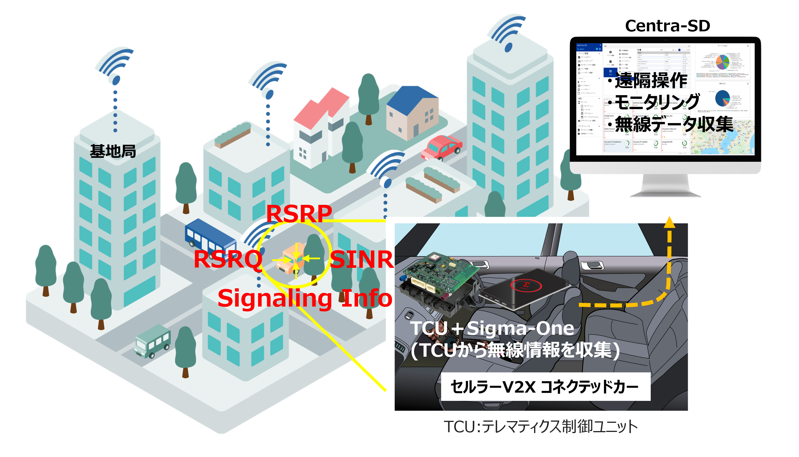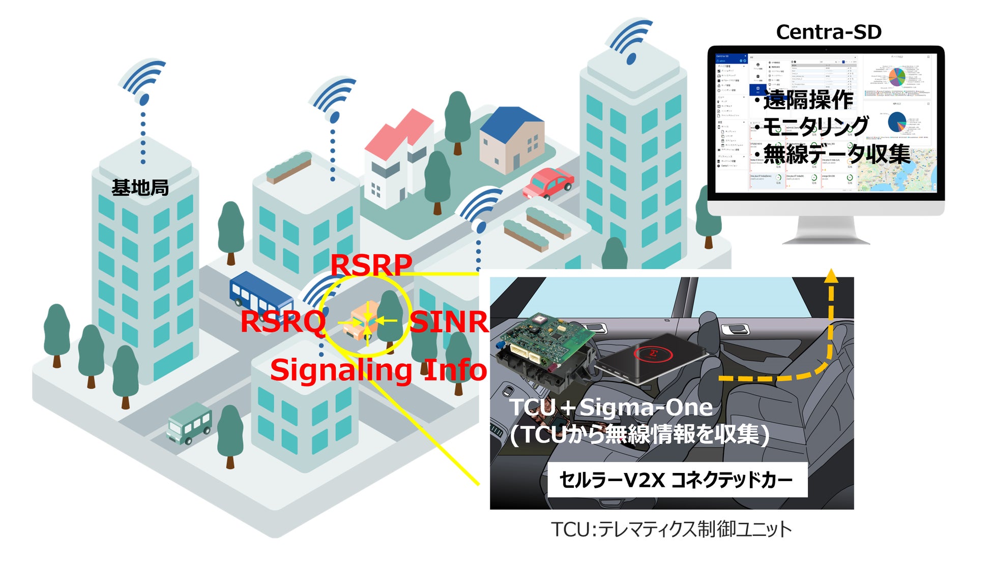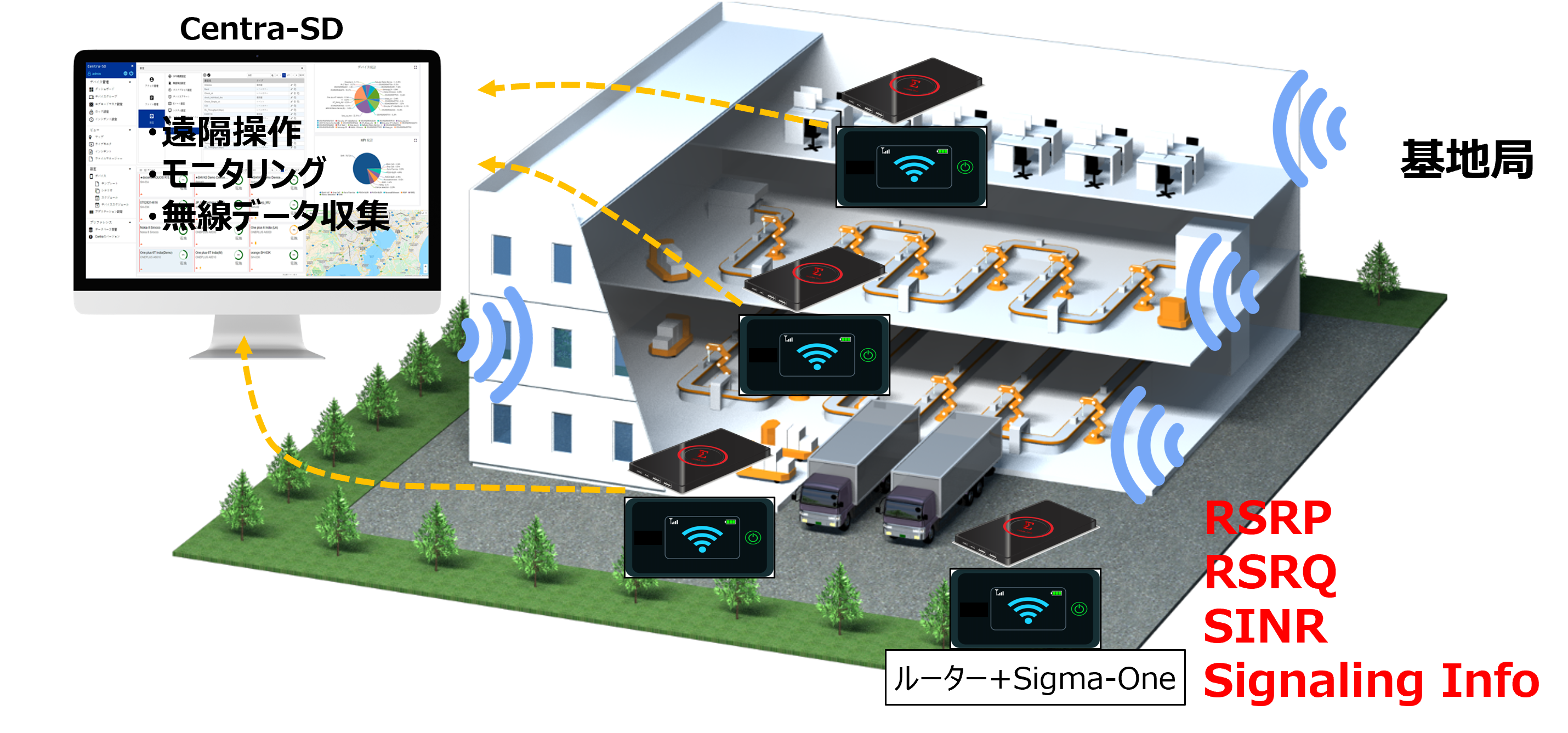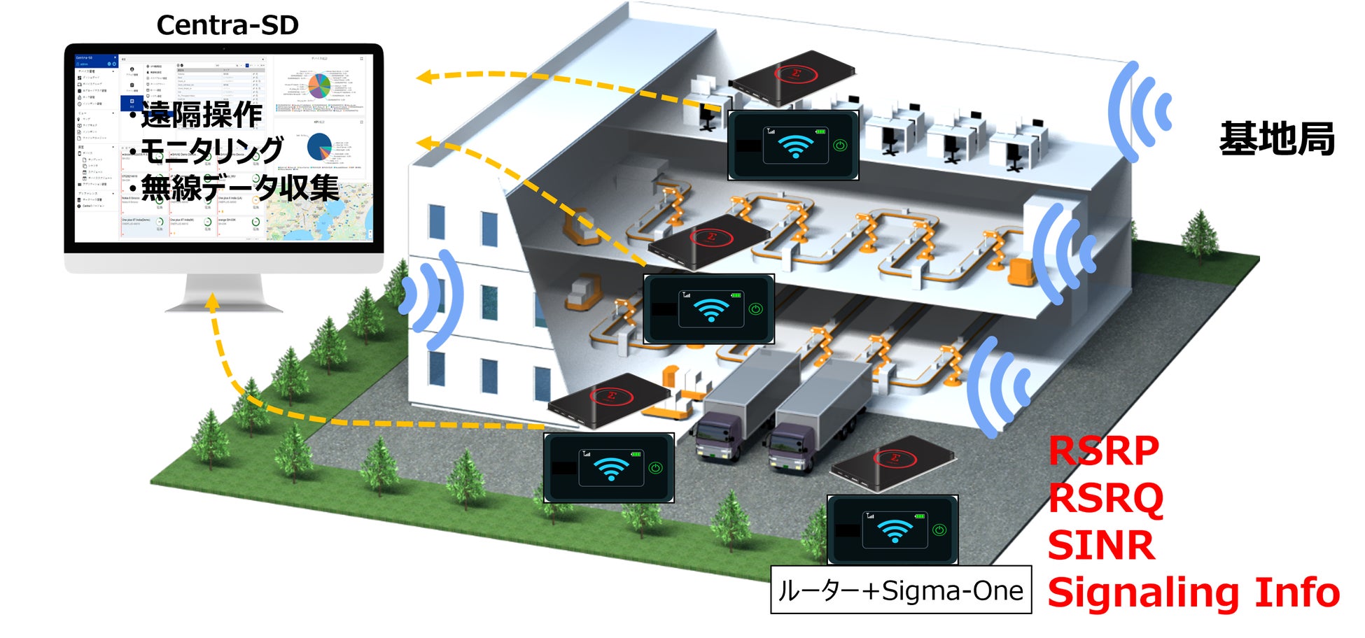 「Sigma-One」は「Sigma」シリーズの最新モデルで、超小型PCに実デバイスをUSB接続し、LTE/5G/ローカル 5Gなどの無線データを収集します。スマートフォンやルーター(CPE)、TCU(テレマティクス制御ユニット)などさまざまな実デバイスに接続できるため、ネットワークの無線品質測定をはじめ、場所の制約により従来は難しかったコネクテッドカーと基地局間の通信モニターなども可能になります。制御は全てCentra-SD(※1)と連携し実行するため、遠隔無人で測定、モニタリングが行えます。