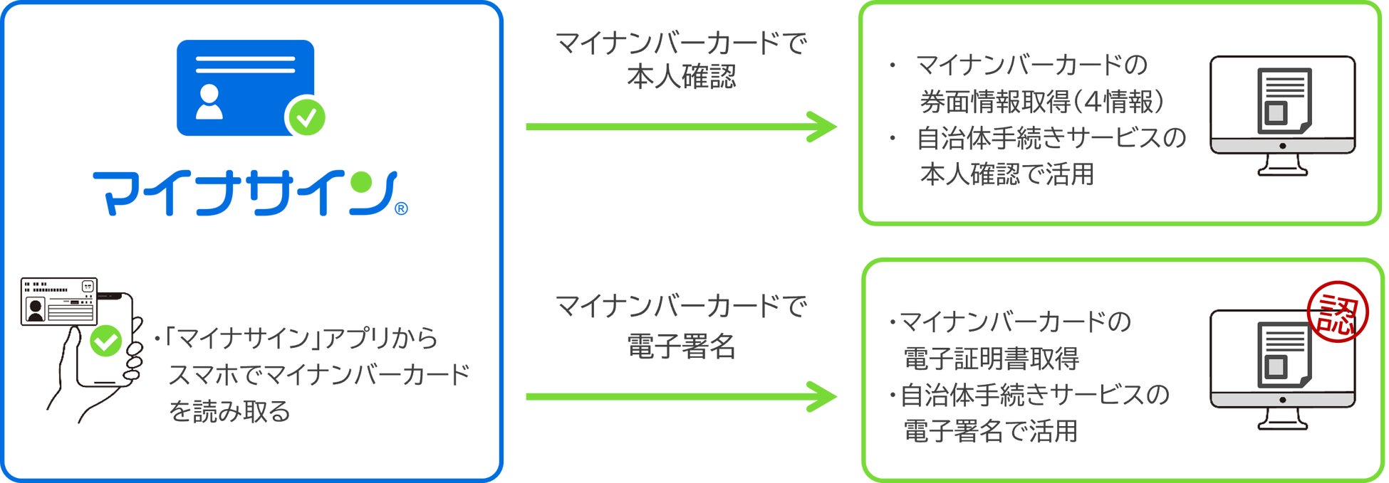 住民(申請者)は、ご自身のスマートフォンにマイナサインアプリをインストールするだけで、事前のユーザー登録などを行うことなく、マイナンバーカードで電子署名を行うことができ、自治体は住民の本人確認を行うことができます。