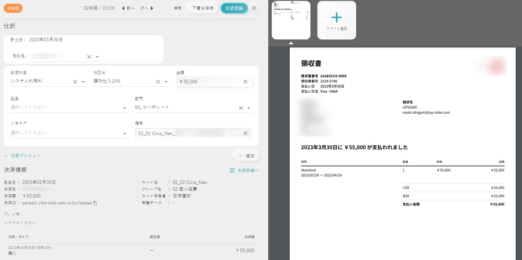 今までの連携では、UPSIDER上の決済を行った際、freee会計へは決済情報のみ連携し、仕訳や、UPSIDER上にアップロードした証憑データは、改めて会計ソフトへの登録が必要でした。