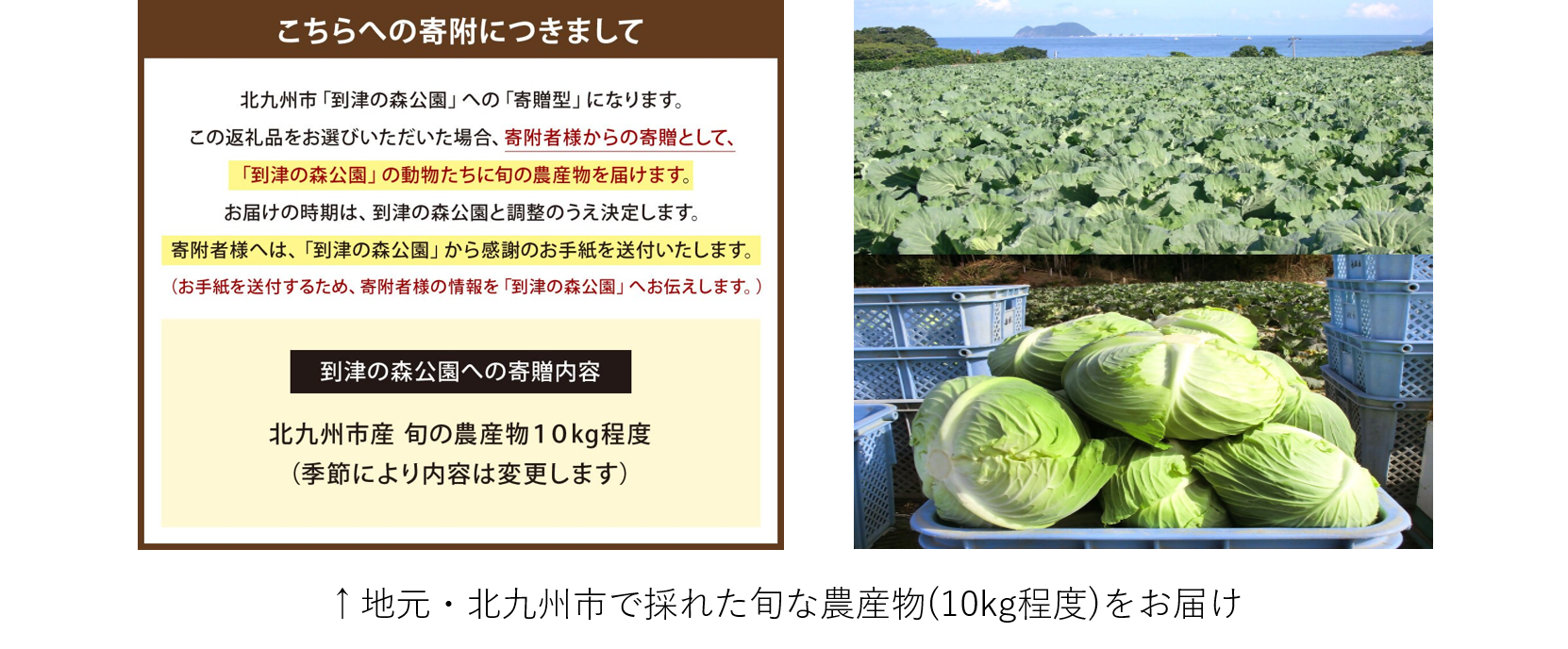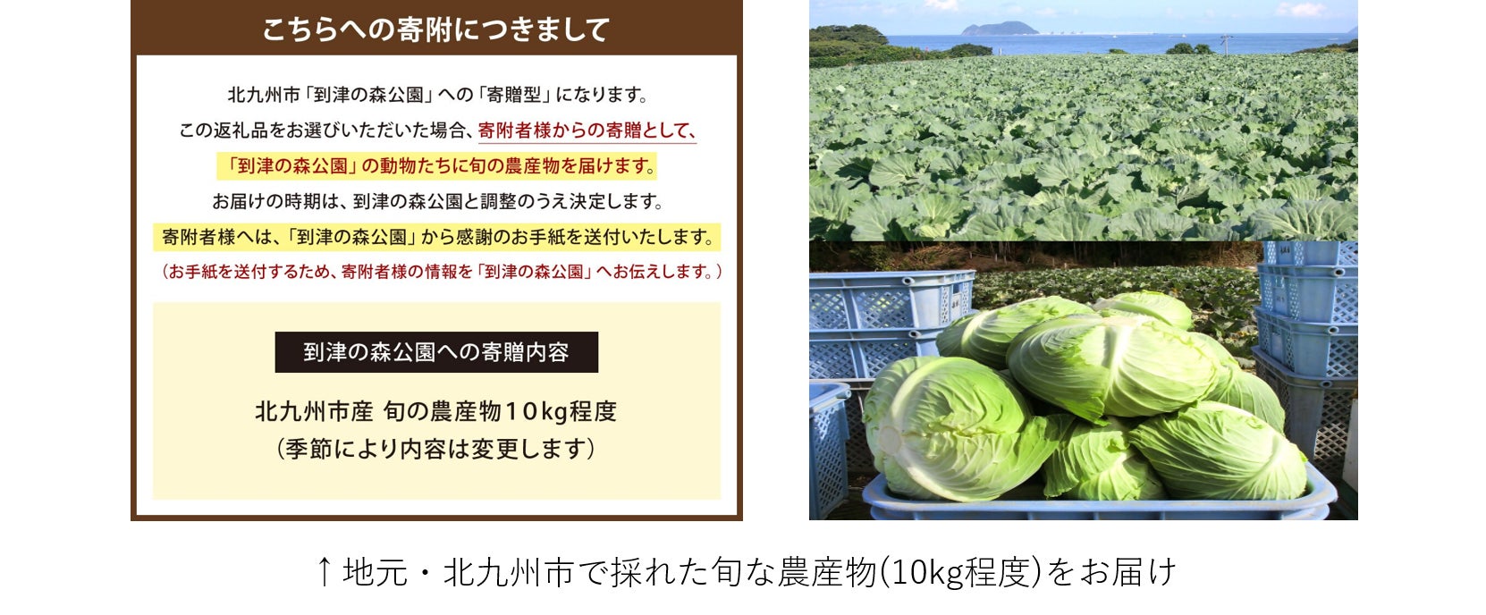 内 容:▼寄附1口につき、「北九州市産の旬な農産物10kg程度」を「到津の森公園」にお届け