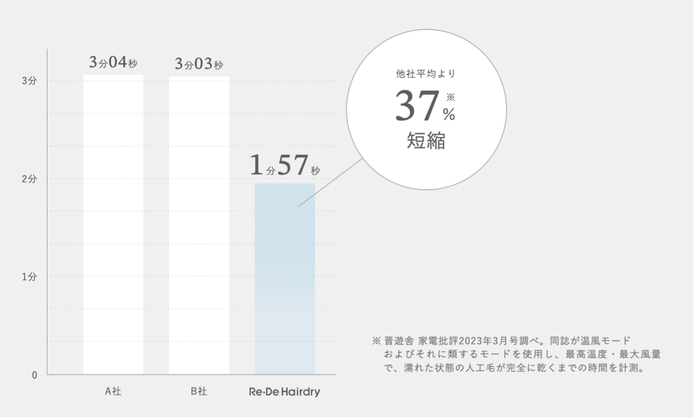 心地をリデザインするブランド「Re・De(リデ)」が展開するヘアドライヤー「Re・De Hairdry」は、業界トップクラスとなる【3.6m3(立方メートル)/分の風量】と【53m/秒の風速】により、ドライ時間を他社平均より37%(※)短縮することを可能にしました。※ 晋遊舎 家電批評2023年3月号調べ。