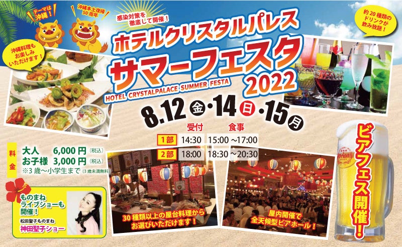 ステージパフォーマンスには、松田聖子さんの歌マネで知られる高い歌唱力を持つ「神田聖子」さんが登場し、3日間の夏フェスを盛り上げます。悪天候の心配がいらない屋内の大ホールにて、感染症対策を万全に整えての開催となります。ご家族やご親戚、ご友人との夏のご会食は、ホテルクリスタルパレスのサマーフェスタ2022で沖縄気分を感じながら美味しくて楽しいひと時を過ごしてみてはいかがでしょうか。皆様のご来場を心よりお待ちいたしております。