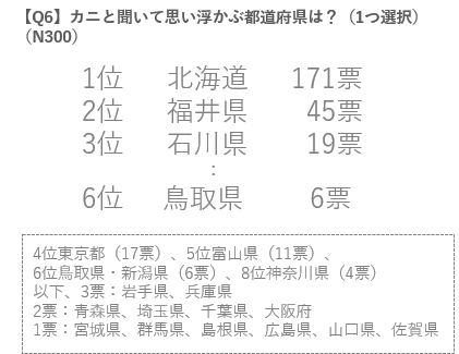 さらに、「カニと聞いて思い浮かべる」のは「北海道」がトップになりましたが、意外にも鳥取県が6位に入る結果となりました。その理由とは...。