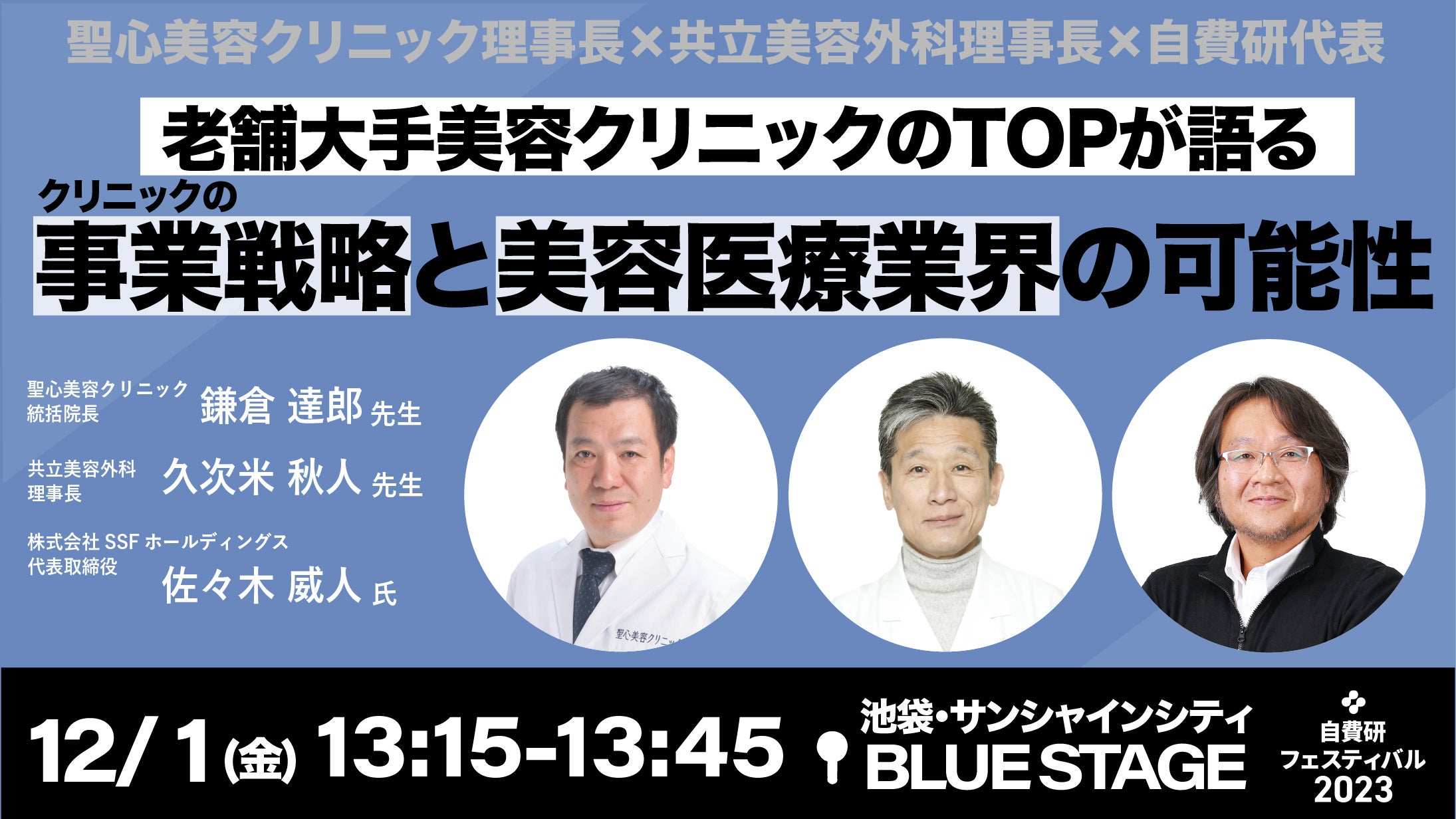 聖心美容クリニック理事長×共立美容外科理事長×自費研代表老舗大手美容クリニックのTOPが語る「クリニックの事業戦略と美容医療業界の可能性」自費研フェスティバル2023にて開催決定!!