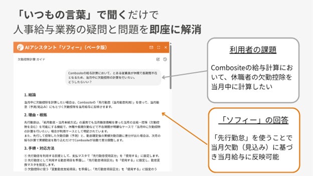 本サービスは、大企業向け人事給与SaaS「Combosite人事給与」に関して、利用者が知りたいことを「いつもの言葉」で入力するだけで、AIが対話形式で必要な回答を提示するAIアシスタントです。AIによる回答の他に、AIアシスタント「ソフィー」への質問内容と回答を要約したうえで、カスタマーサクセスチーム(CS)へ問い合わせできる機能も実装しています。