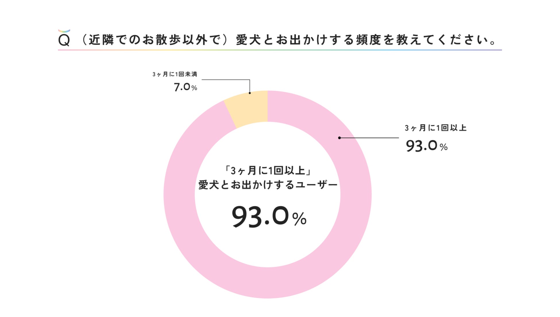 さらに、Wan!Passユーザーのお出かけ意欲は極めて高く、「(お散歩以外で)愛犬とお出かけする頻度」について、93%のユーザーが「3ヶ月に1回以上」と回答しており、愛犬と共にあるライフスタイルを大切にしていることがわかります。
